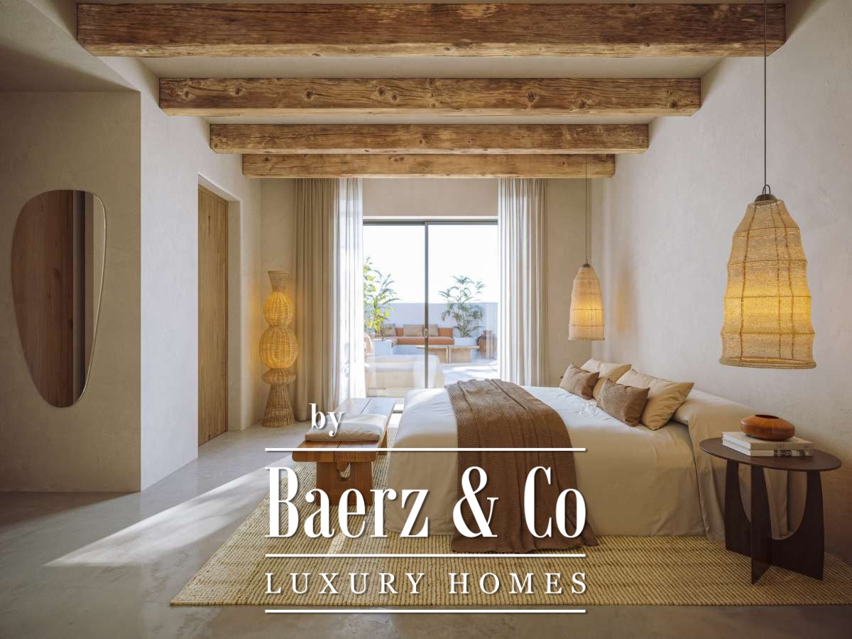 as the sun sets. Extras? Think of your own gym, wellness room with spa, a spacious garage and a stylish man cave, your personal retreat for relaxation or entertainment.This villa is not just a place to live, but a place to experience. Every detail is right, from the layout to the choice of materials. Everything is aimed at creating a carefree lifestyle where comfort and class go hand in hand.The outdoor spacesThe outdoor area of this villa is a true oasis. A sleekly designed infinity pool forms the heart of the garden, surrounded by palm trees and Mediterranean planting. Various lounge zones invite relaxation in the sun or a cocktail at sunset. The outdoor kitchen with pergola and dining table is the setting for long summer evenings with friends or family – here you live outside as if it were your living room.With views over the valley and surrounding nature, you feel like you are in a private paradise, far from the hustle and bustle but close to everything you need. Thanks to careful landscape architecture the garden remains intimate and atmospheric, with spots to unwind, to connect, or simply to enjoy the moment. This villa is not a house; it is a lifestyle. The plot is 90% excavated, so once the final 10% is completed you can start building immediately.A unique opportunity to create your own piece of Ibiza, exactly as you want it. Ready to fall in love? Contact Ibiza Estates and let yourself be guided through this dream that can become reality.