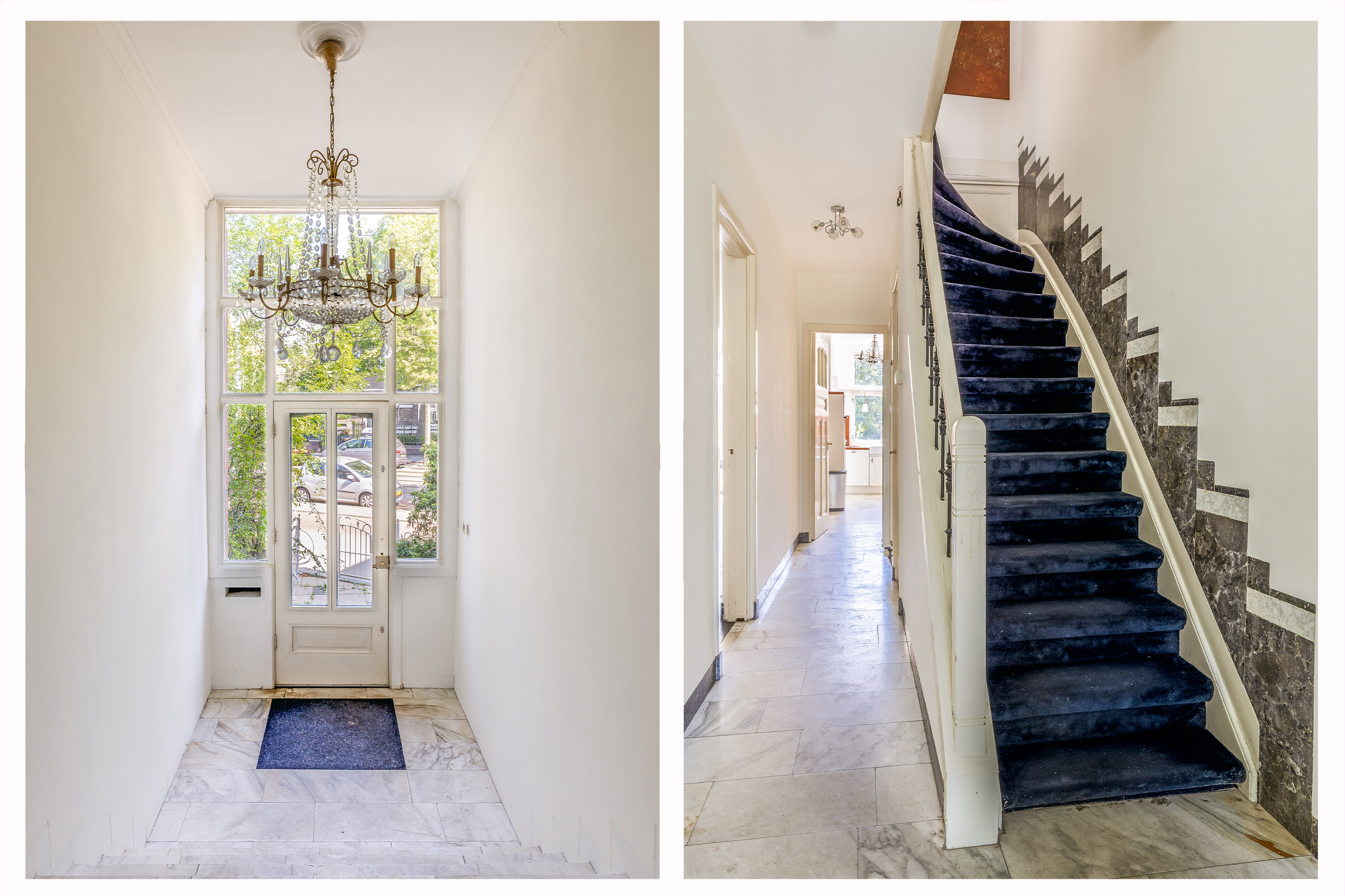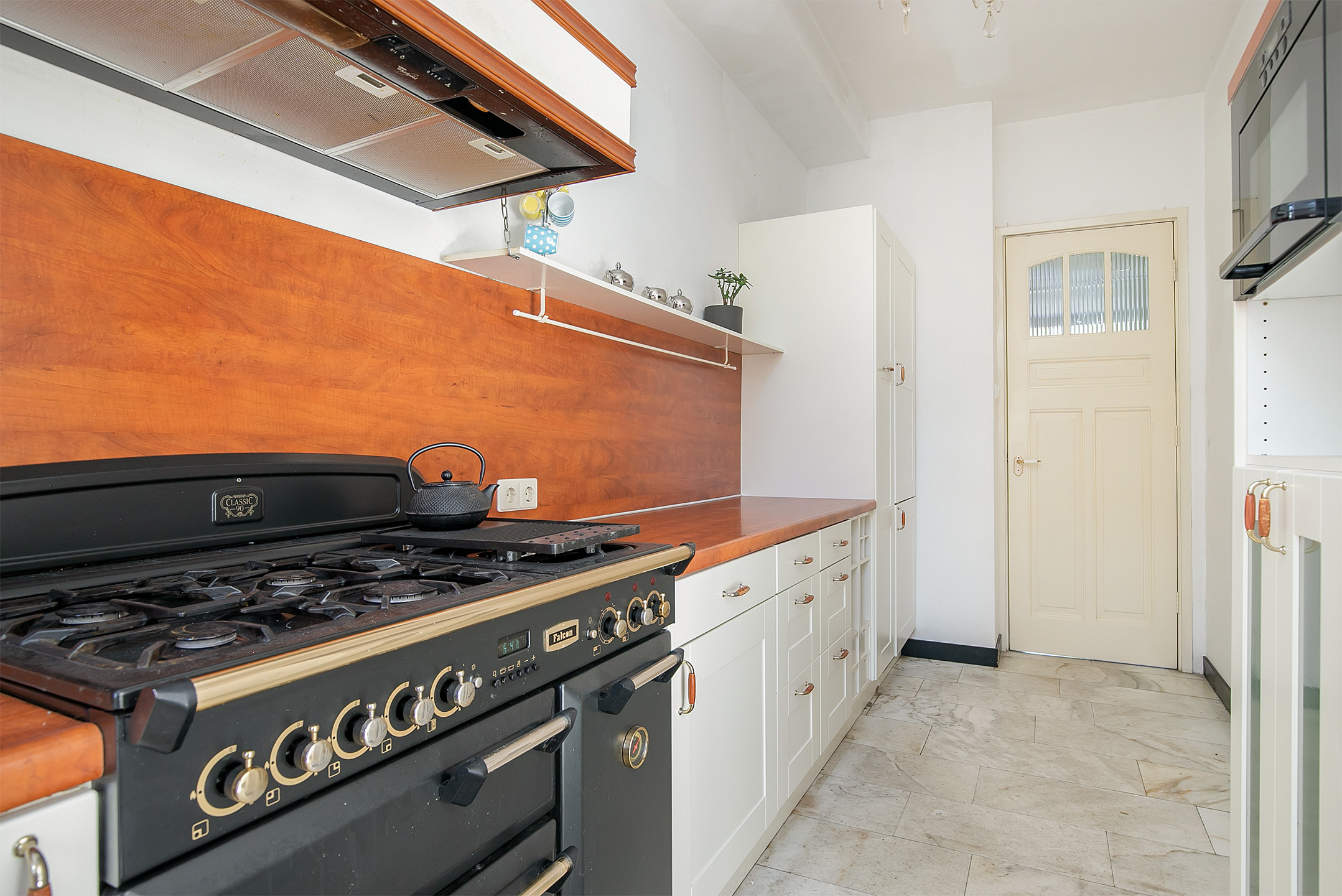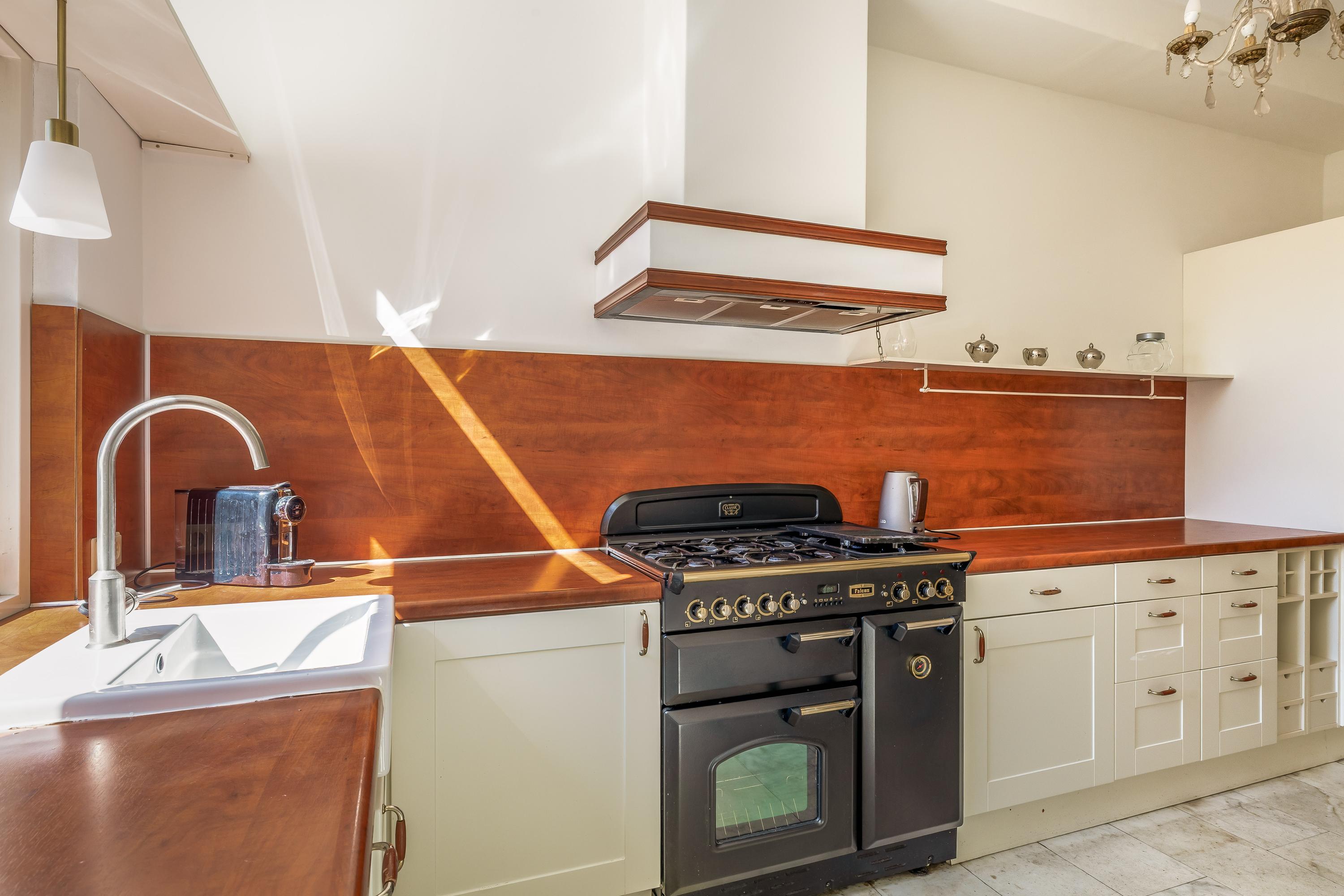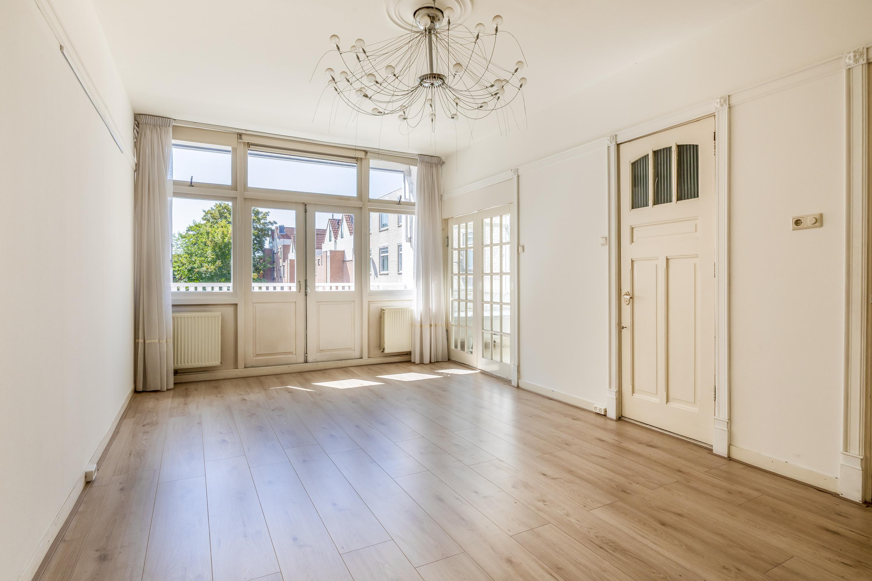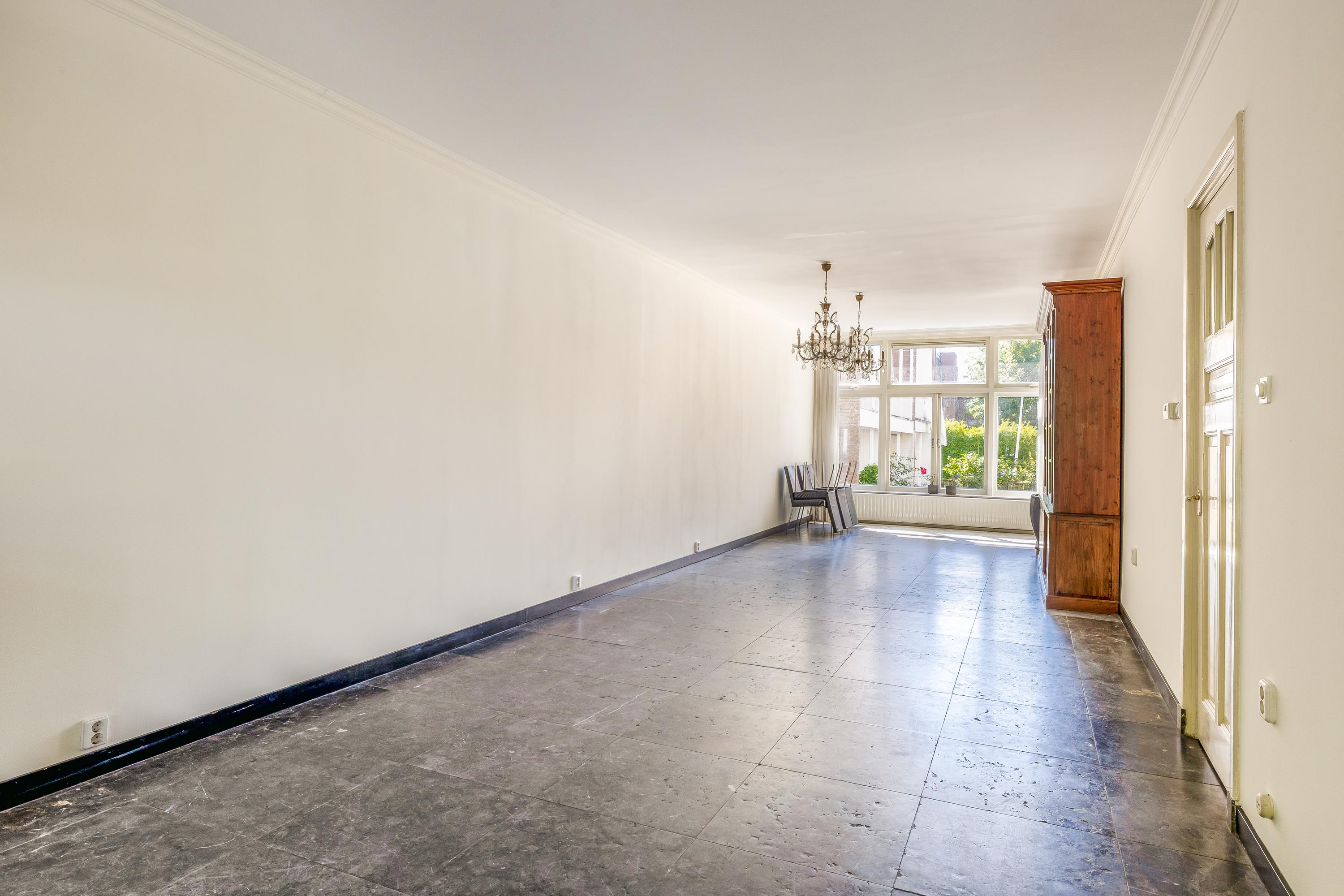 Bij binnenkomst kom je in de imposante entree met marmeren tegels. Vanuit hier is de lange hal met toilet en trapkast toegankelijk, die het leefgedeelte verbindt. Direct valt de hoogte van de plafonds op. De woonkamer van 14 meter lang is momenteel ingedeeld in een zitgedeelte aan de voorzijde en een eetgedeelte aan de achterzijde, met toegang tot de halfopen keuken. Door de ruime indeling heb je voldoende mogelijkheden om de ruimte helemaal naar eigen smaak in te richten. Voorheen was het souterrain bereikbaar via een trap in de eetkamer, maar het is ook mogelijk om deze verbinding opnieuw te realiseren. De keuken is uitgerust met een 5-pits gasfornuis met oven, afzuigkap, vaatwasser, spoelbak en koel-vriescombinatie. Dit is een heerlijke plek waar je tijdens het koken interactie kunt hebben met je gezelschap.