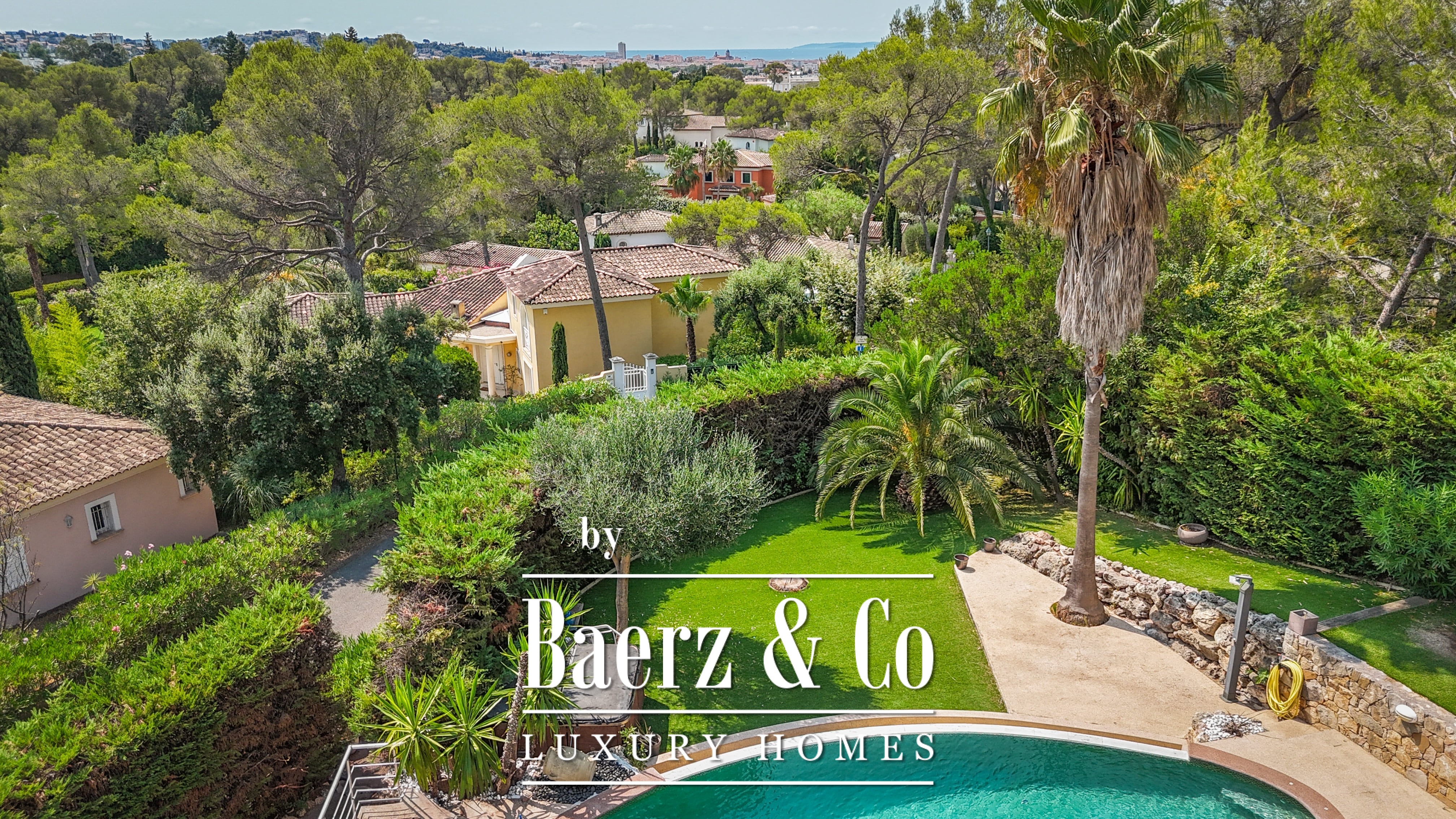 The 1,511 m² landscaped plot surrounds the home with mature gardens, multiple terraces, and an infinity pool. On the lower level, find a games room, double garage, and utility spaces. Features such as aluminum frames, central electric shutters, alarm, video surveillance, and electric gate enhance peace of mind.