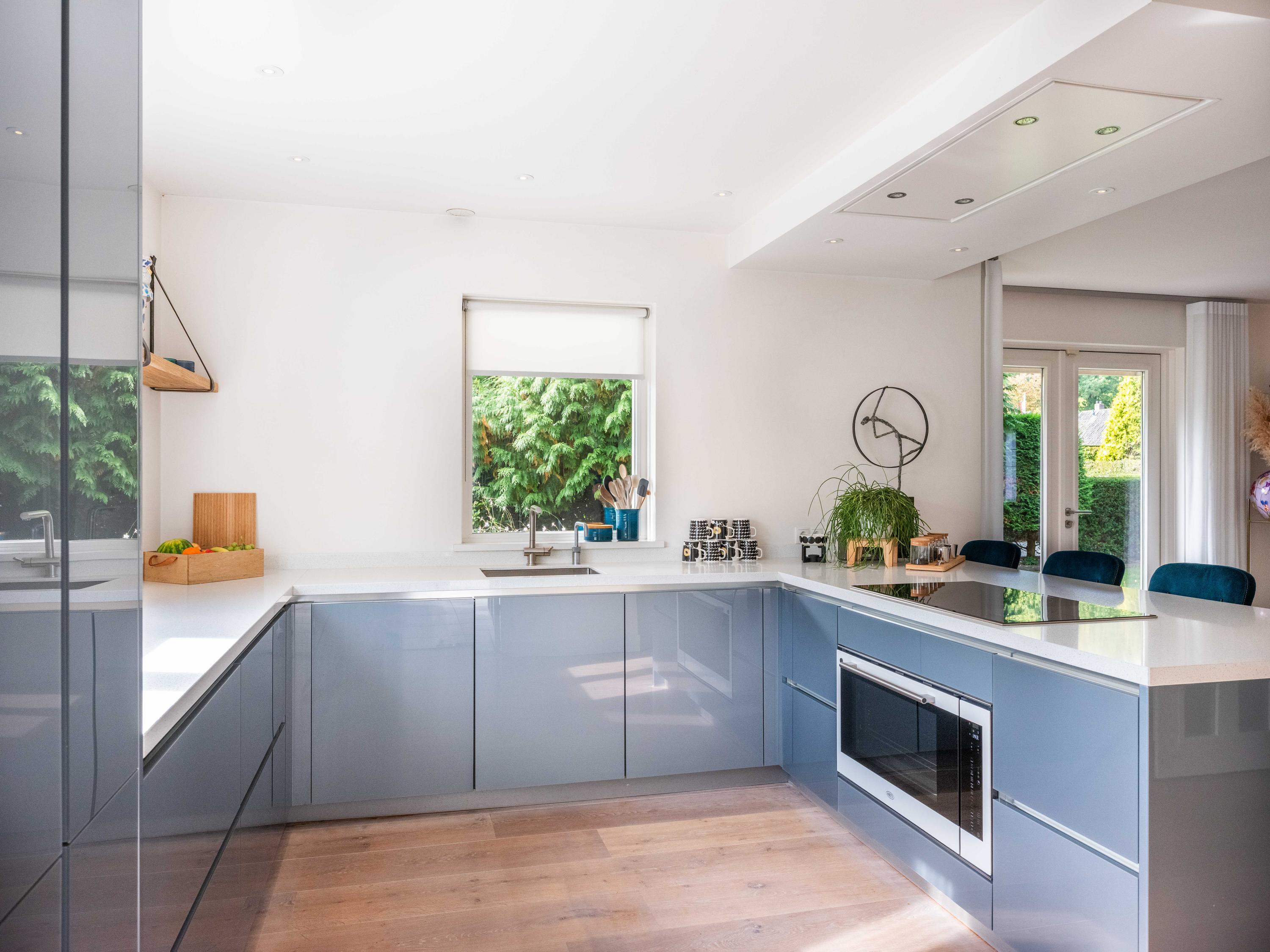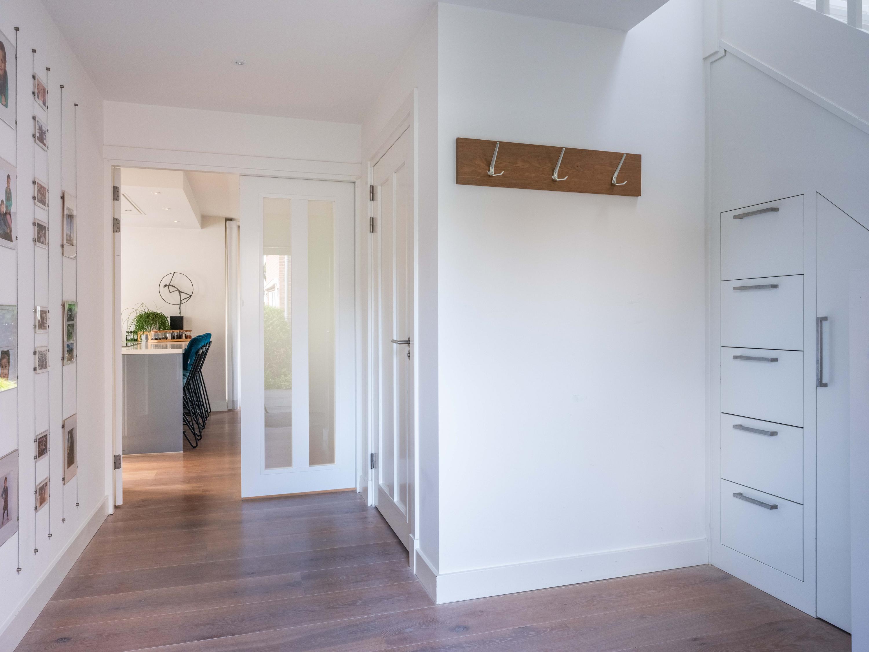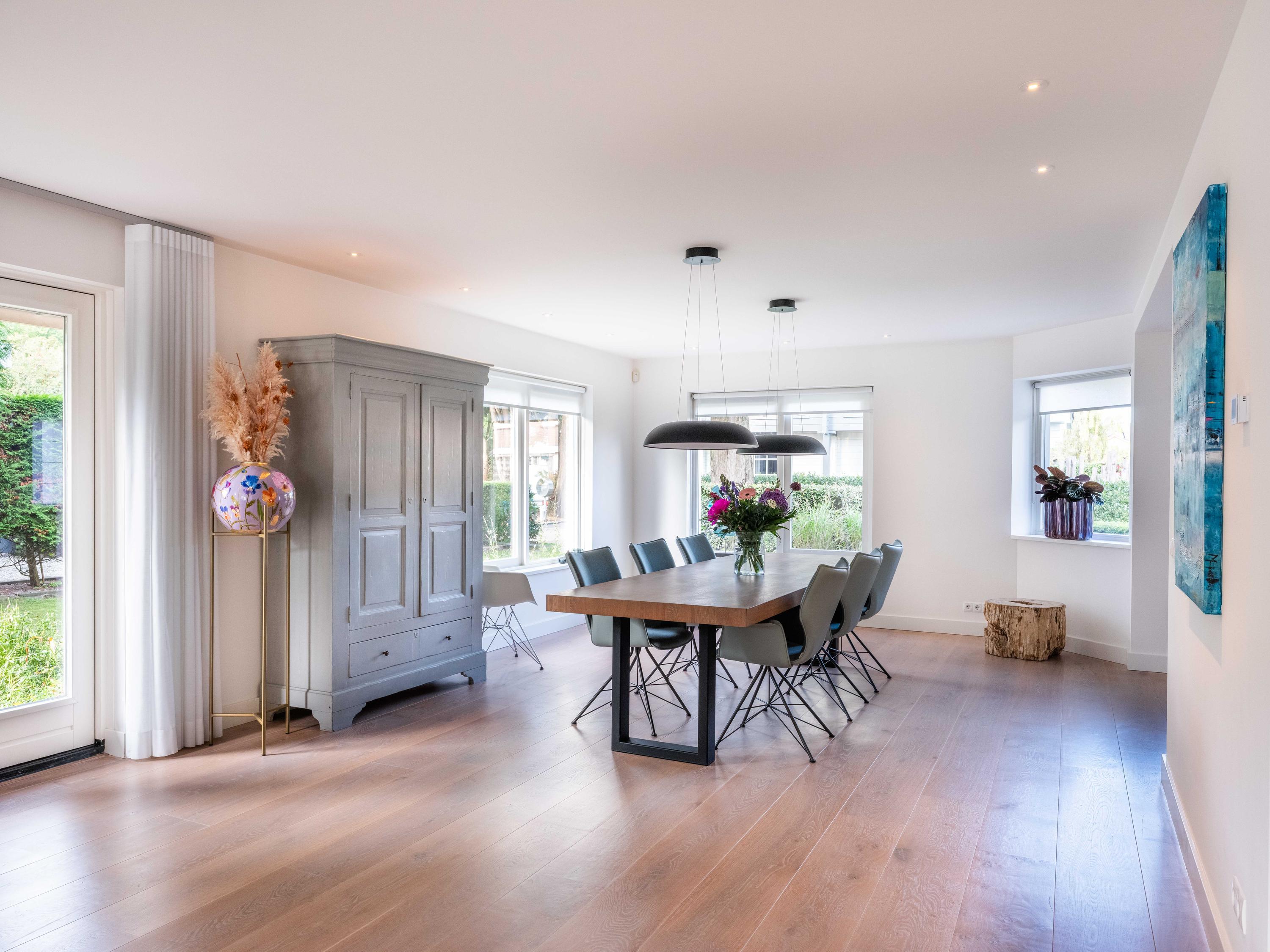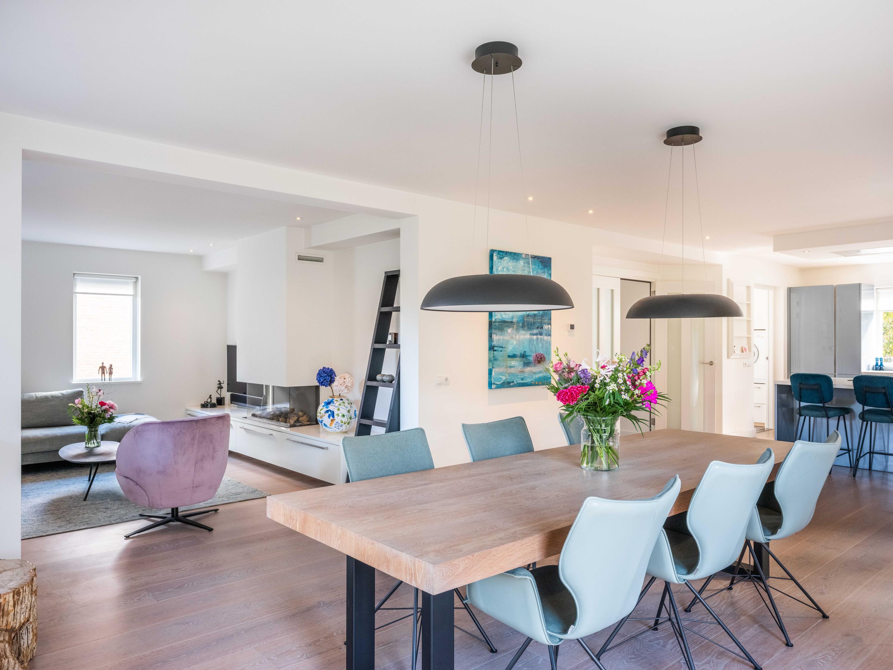 Double doors give access to the spacious L-shaped living room, where you are immediately welcomed by lots of light thanks to the large windows. In the corner is a cosy sitting area with an attractive gas fireplace. The oak laminate flooring in combination with underfloor heating throughout the ground floor creates a warm and comfortable atmosphere.
