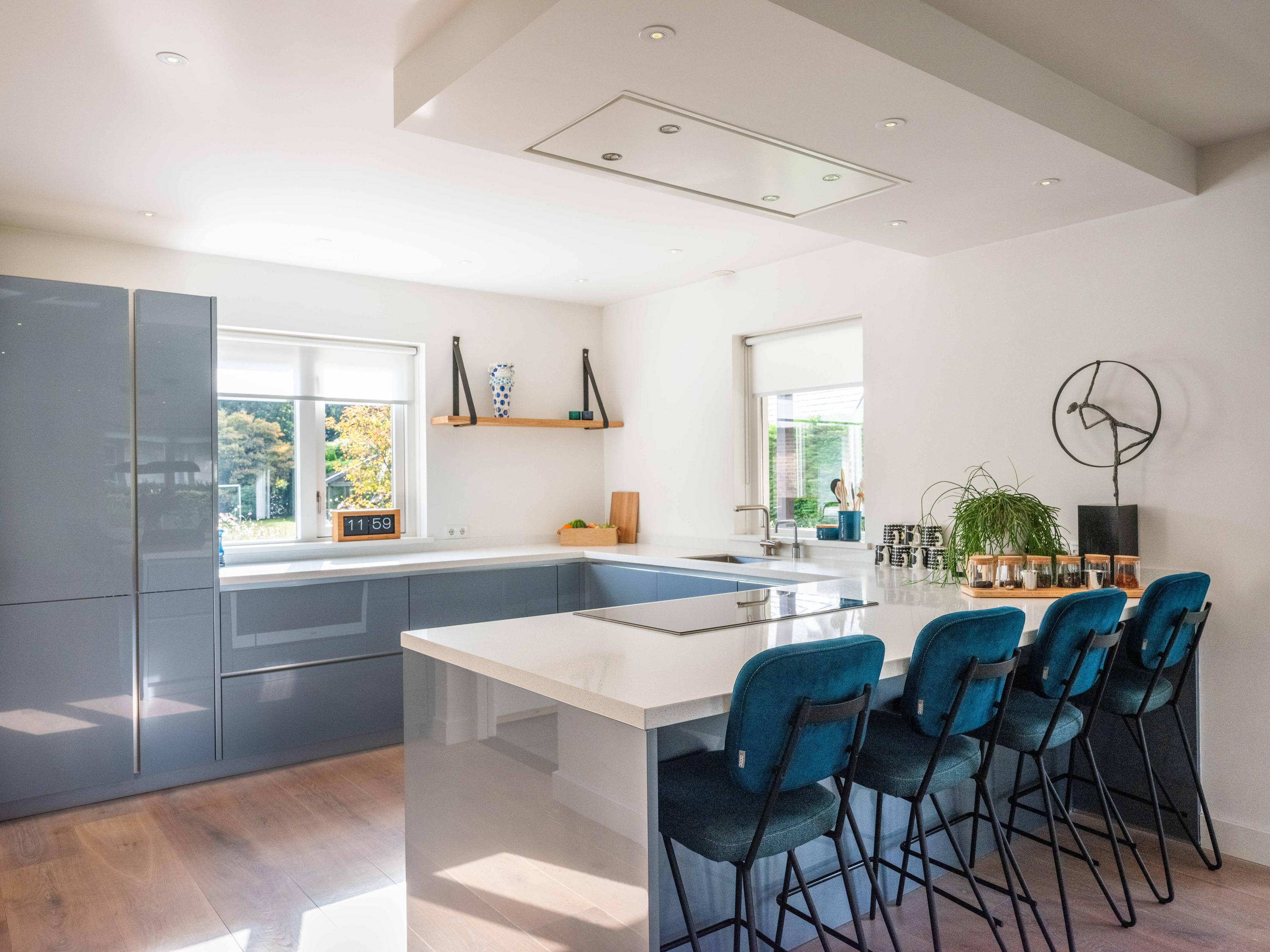 The open kitchen is attractively decorated and equipped with a cosy bar with seating. From the kitchen, you can enjoy a beautiful view of the garden and there is a direct connection to the living room. Thanks to the open layout and abundant light, everything feels spacious, fresh and inviting.