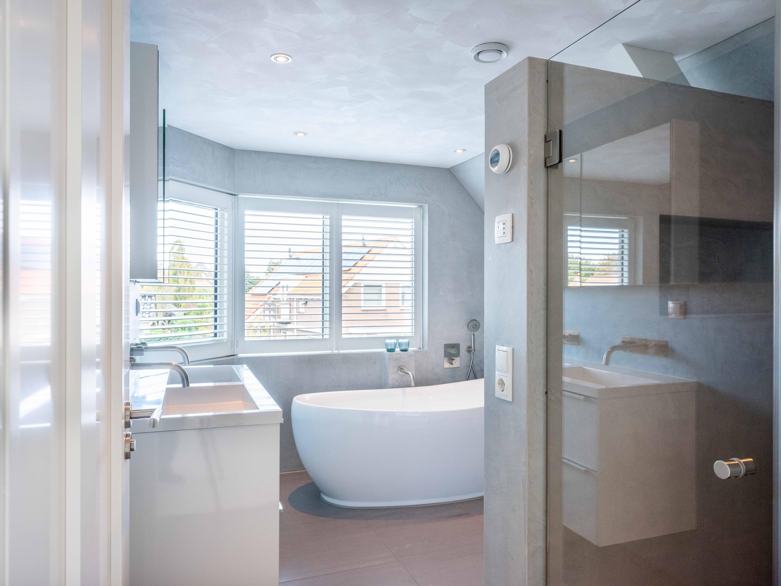 On the first floor, there are three bedrooms and a spacious bathroom with double sink, toilet, bathtub and a generous double walk-in shower. Underfloor heating is also present here, as well as a radiator. The master bedroom is spacious and has plenty of built-in cupboard space. There are two additional bright bedrooms, both with built-in cupboards and access to a private balcony. There is a handy storage cupboard under the stairs to the attic.