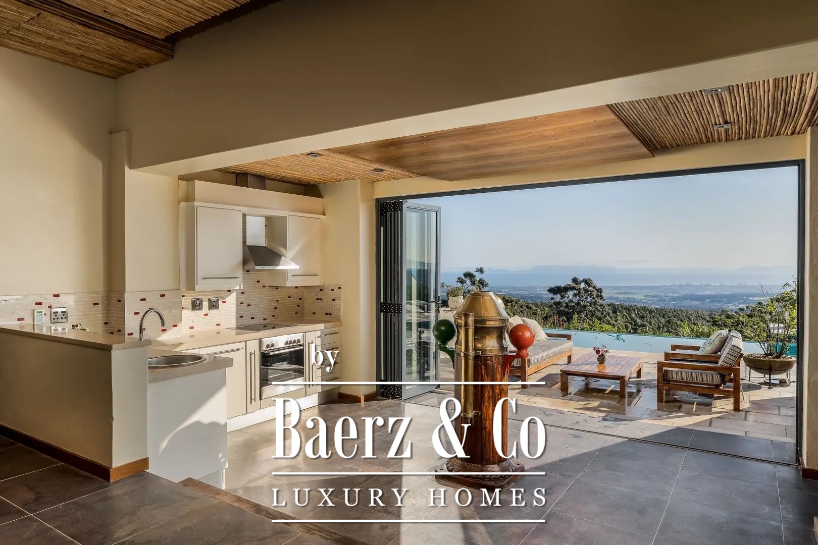A spacious parking area with covered entrance provides access to the beautiful hall with vestibule and cloakroom. On this ground floor -the first living level- you will find a garden room with fireplace, featuring a home office setup with unique views of the surrounding landscape; an atmospheric living room with braai and full-glass sliding doors to a large terrace overlooking the bay and mountains; a cosy dining room with terrace access; a semi-open fully equipped kitchen with two ovens, warming drawer, 5-burner gas hob, extraction system, dishwasher, and fridge-freezer; a utility room with laundry area and kitchenette; bedroom (1) with terrace, walk-in closet and bathroom with bathtub, shower cabin, vanity and toilet; bedroom (2) with terrace, walk-in closet and bathroom with bathtub, walk-in shower, vanity and toilet; hallway with separate toilet, basin and shower, also with access to the terrace.