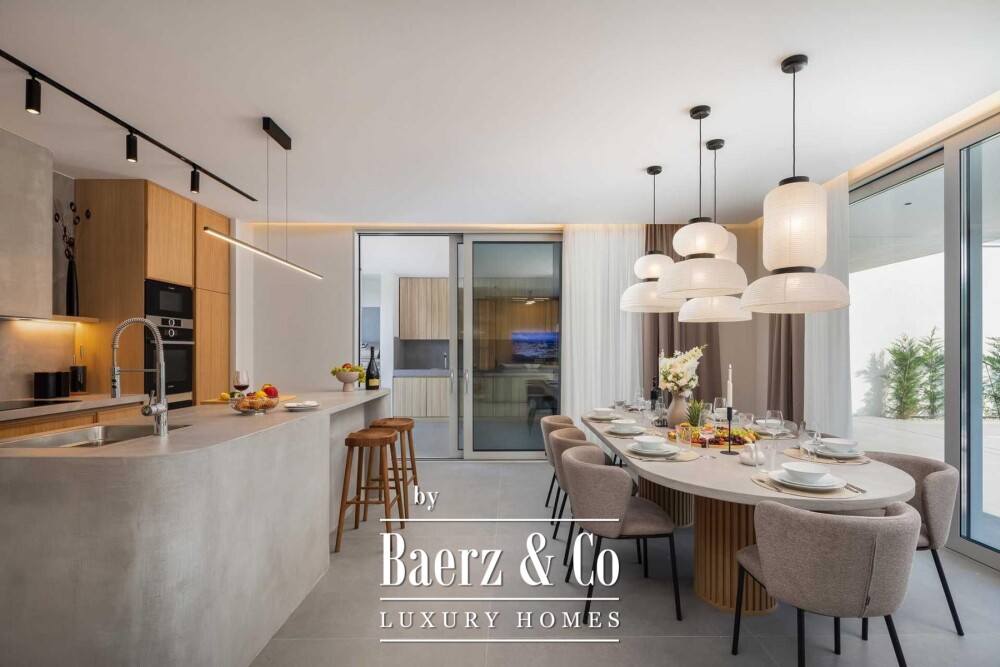 The entrance leads to a considered ground floor layout, where a fitness space with sauna and a bathroom set the tone for wellbeing. An open-plan kitchen, dining, and living zone is defined by expansive glass walls that orchestrate the flow of daylight and blur the threshold between inside and out. Covered terraces adjoin both the kitchen and living area, leading to a heated swimming pool and a landscaped sun deck.