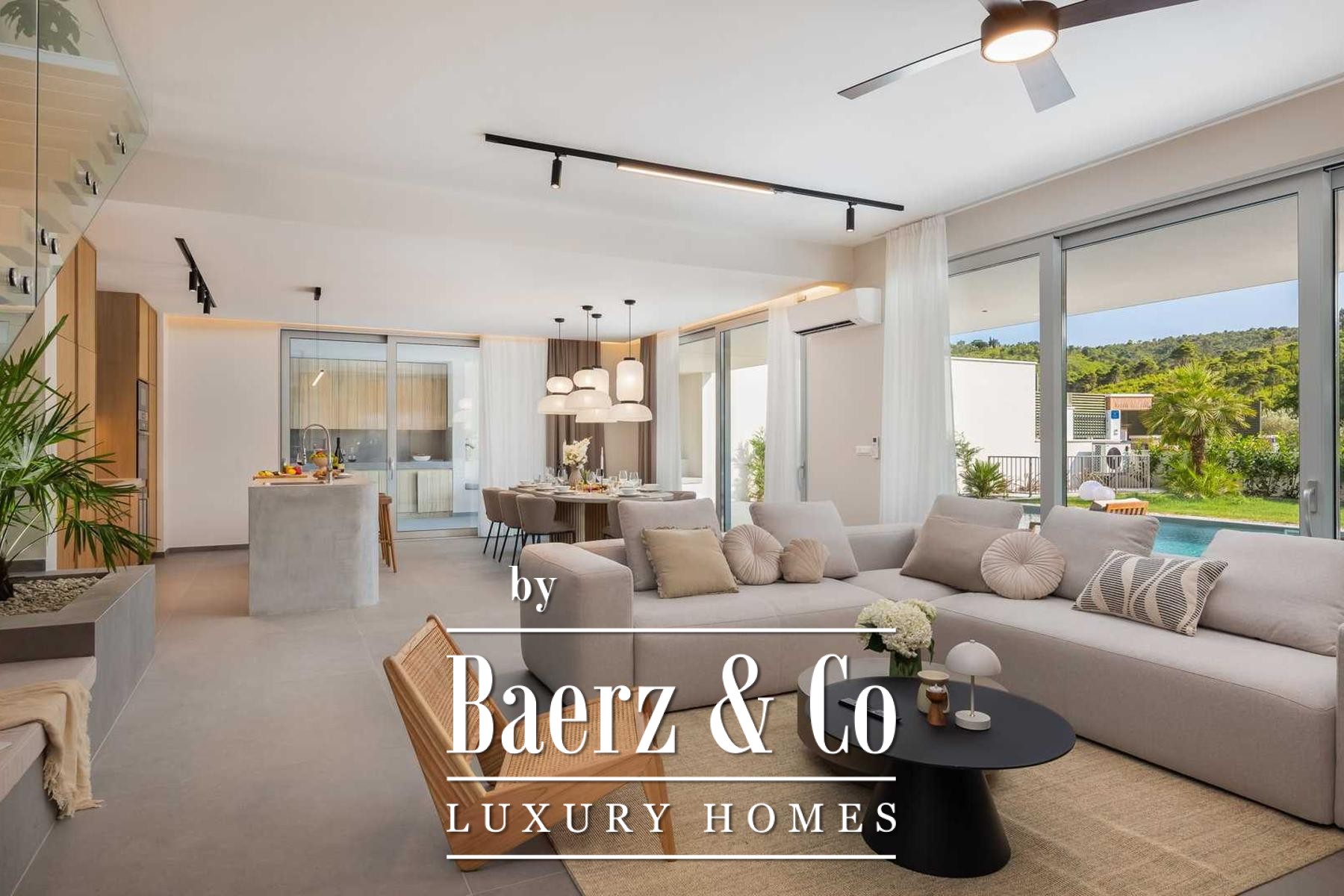 Villa Split Okolica offers a contemporary retreat on a generous 2,090 m² plot, distinguished by privacy and refined spatial planning. This villa’s 330 m² of living area unfolds over two levels, each crafted for balance between private sanctuary and versatile entertaining.