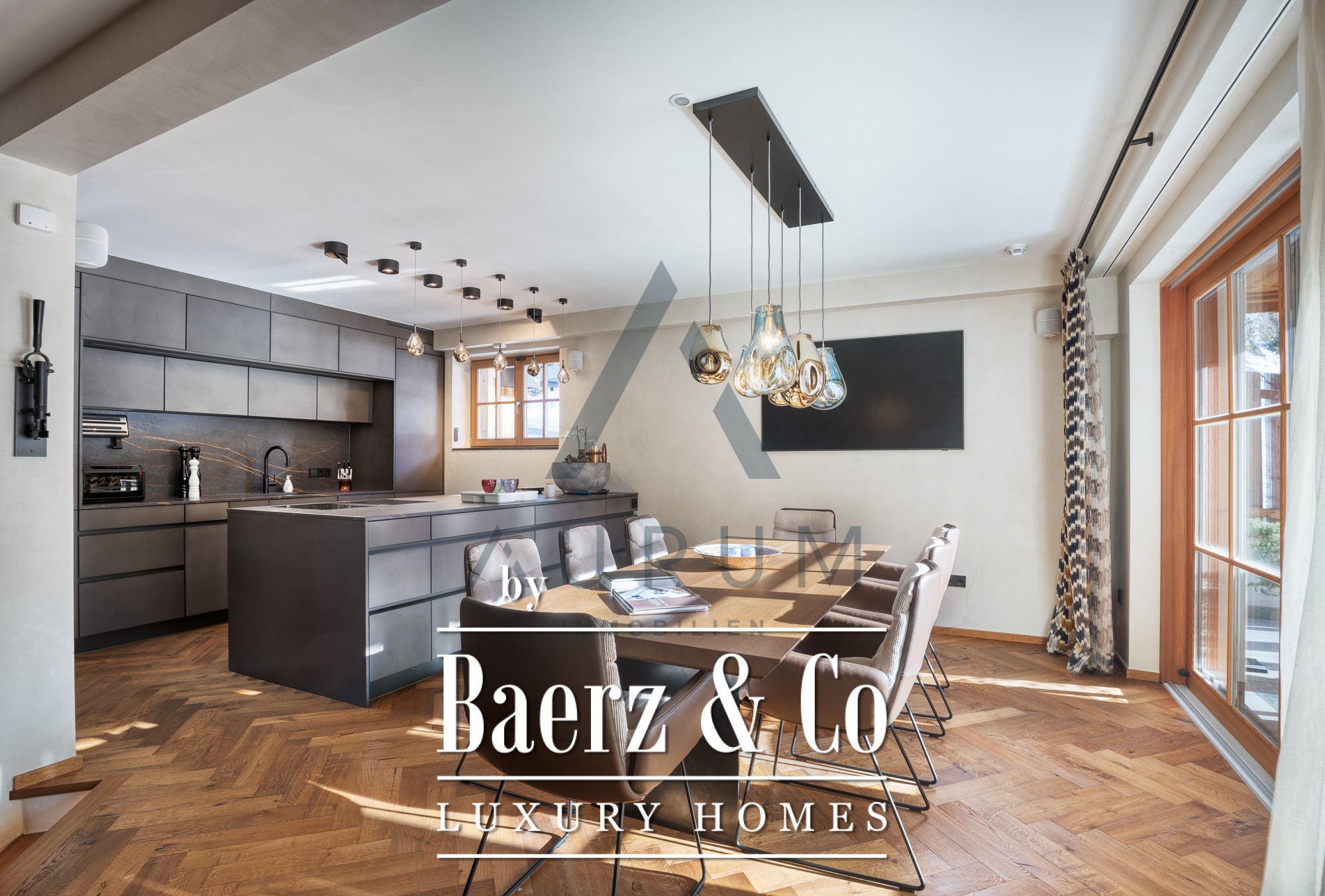 Throughout the interiors, elegant designer furniture, bespoke joinery, and reclaimed timber features reveal a devotion to craftsmanship. The kitchen is fitted with Gaggenau appliances and high-end fixtures, complemented by exclusive hardwood floors and a designer lighting concept. Two distinct apartments within the residence offer complete privacy, each equipped with their own kitchen and bathroom, allowing for flexibility in family living, guest accommodation, or remote work.