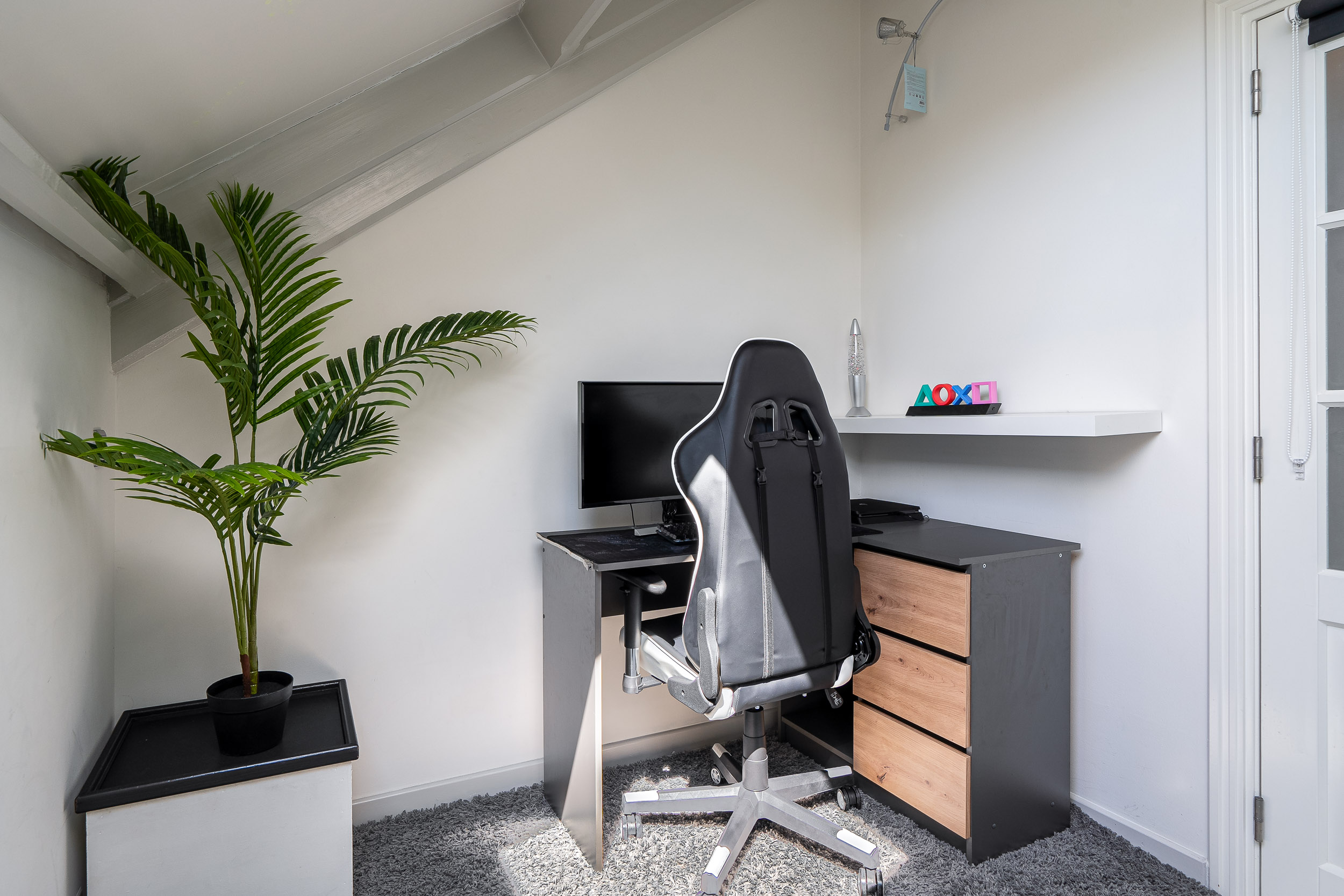 A recently built fully insulated guesthouse, studio, or home office is located in the garden. It includes a kitchenette and bathroom, making it suitable for multiple uses. The large southwest-facing windows offer inspiring panoramic views of nature toward the IJsselmeer, with its ever-changing Frisian skies.