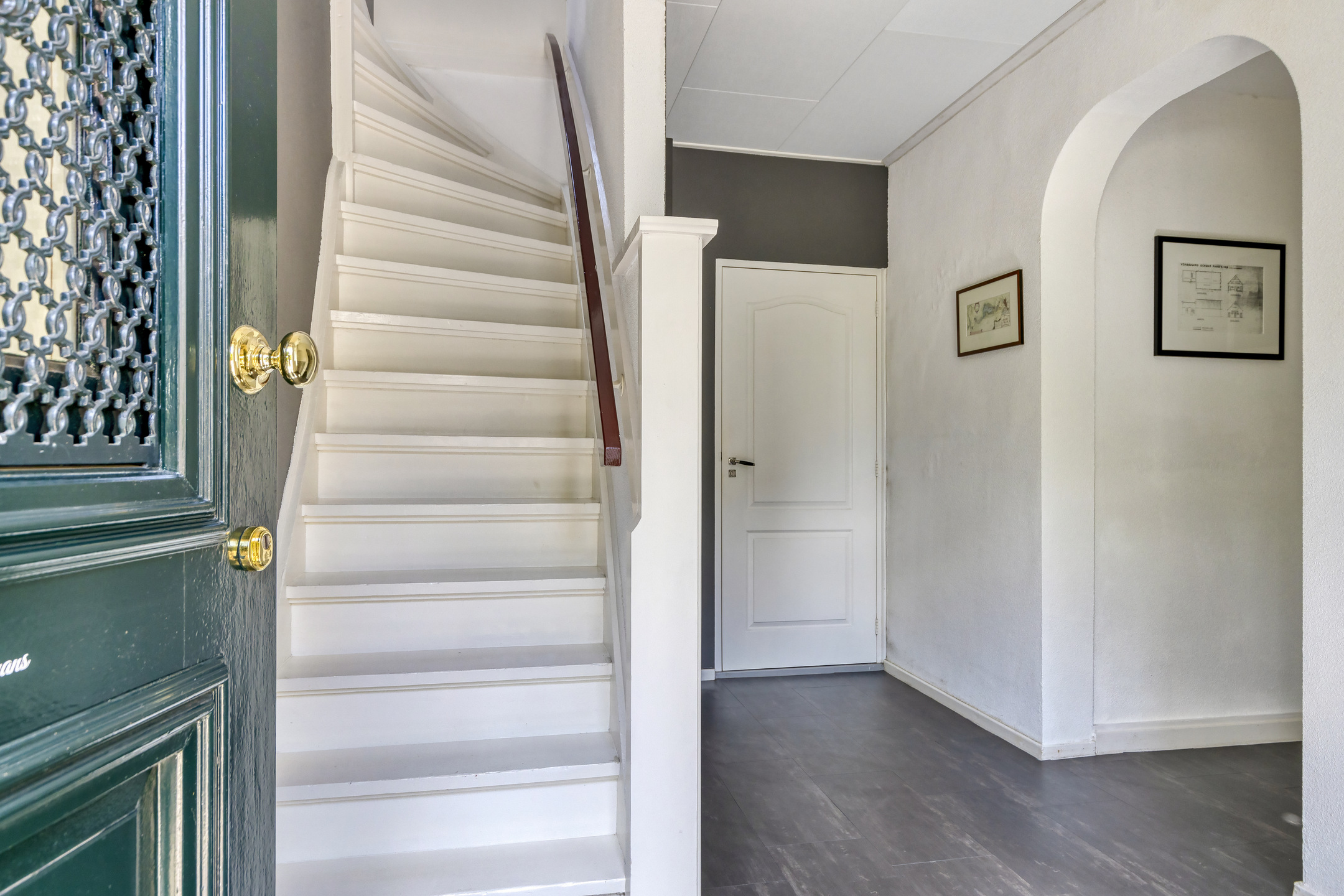 tussenhal, wandafwerking stucwerk, tegelvloer, plafond afgewerkt met stucwerk;