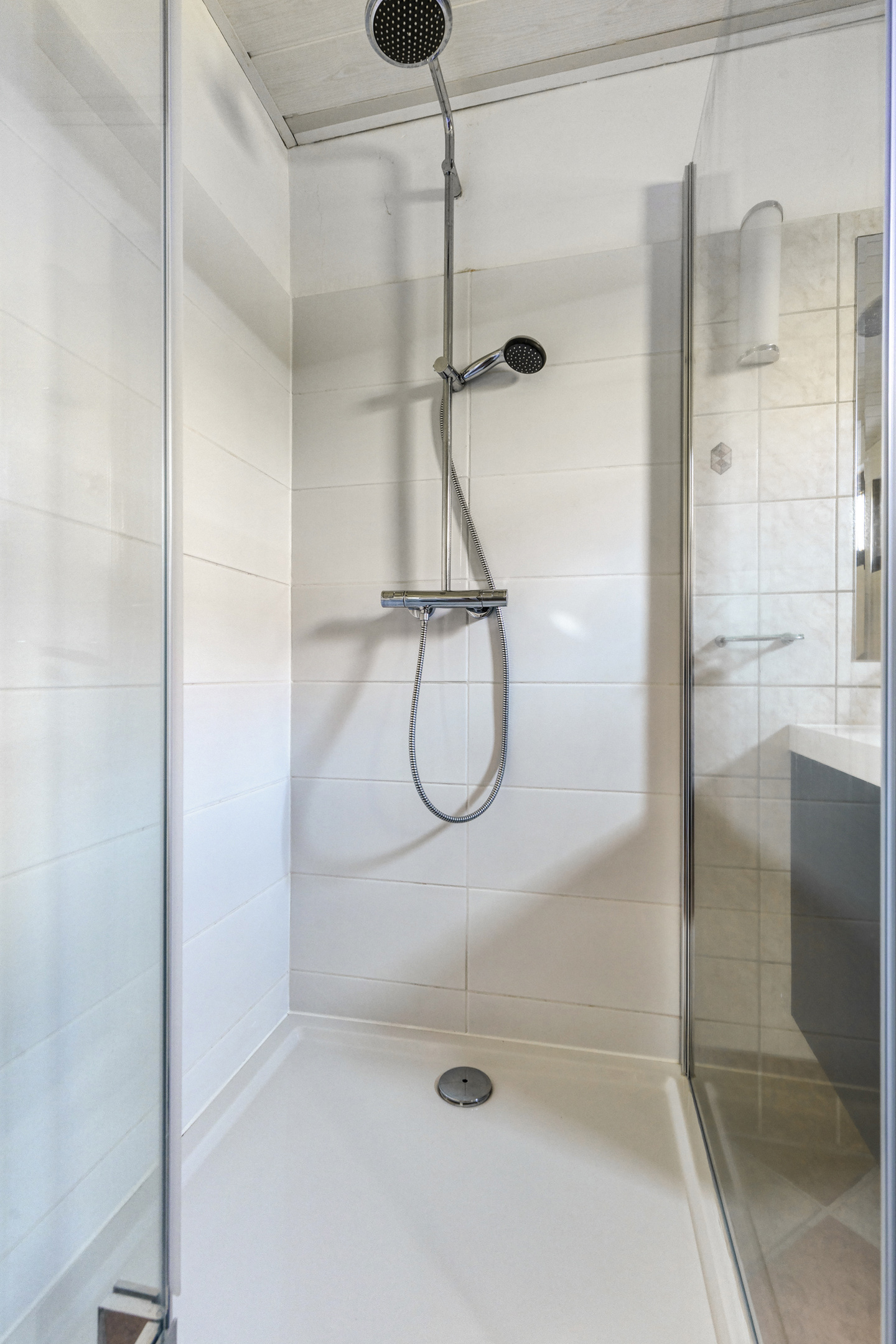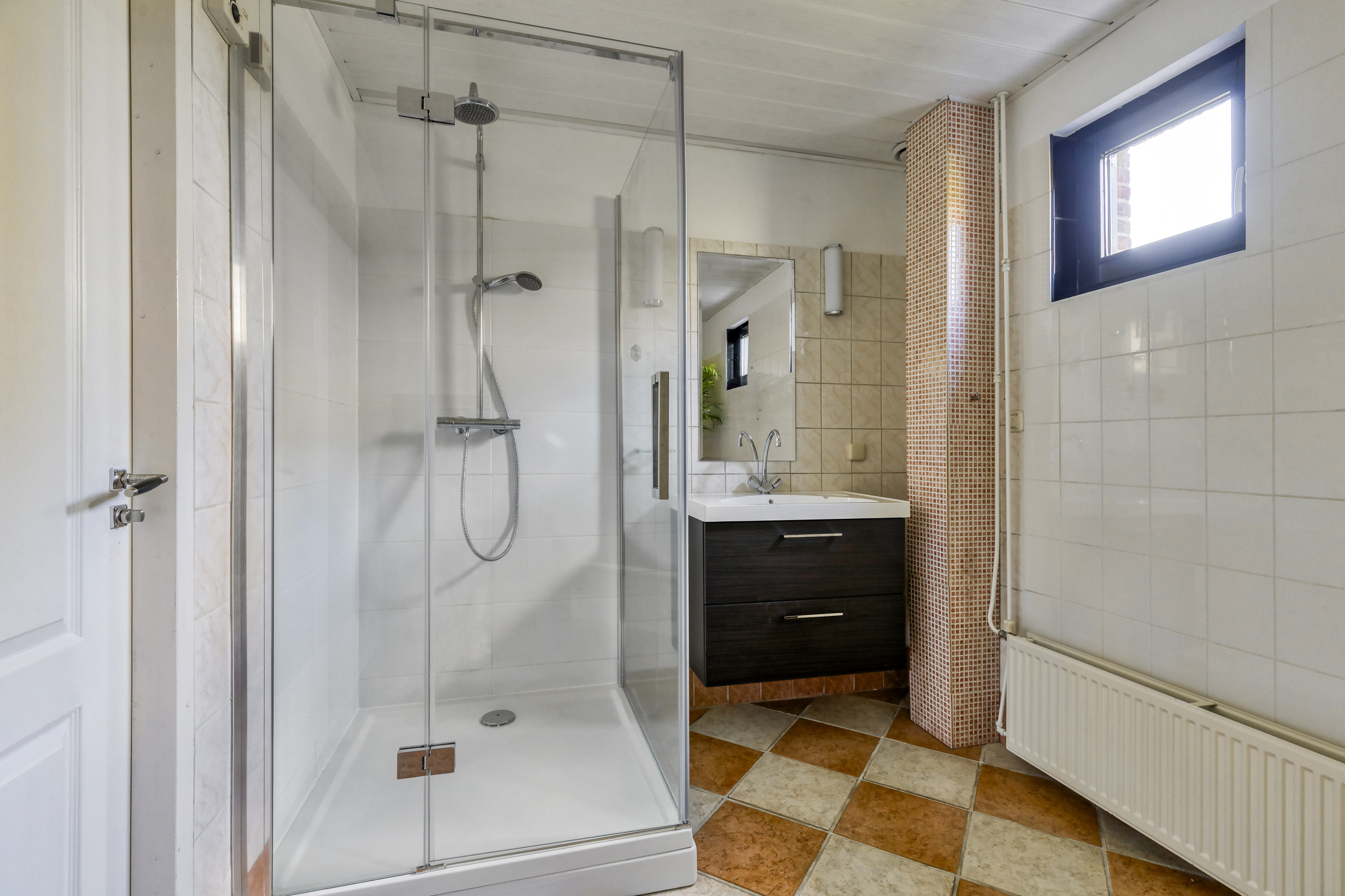 betegelde badkamer, voorzien van een douchecabine, badkamermeubel met een wastafel en mechanische ventilatie;