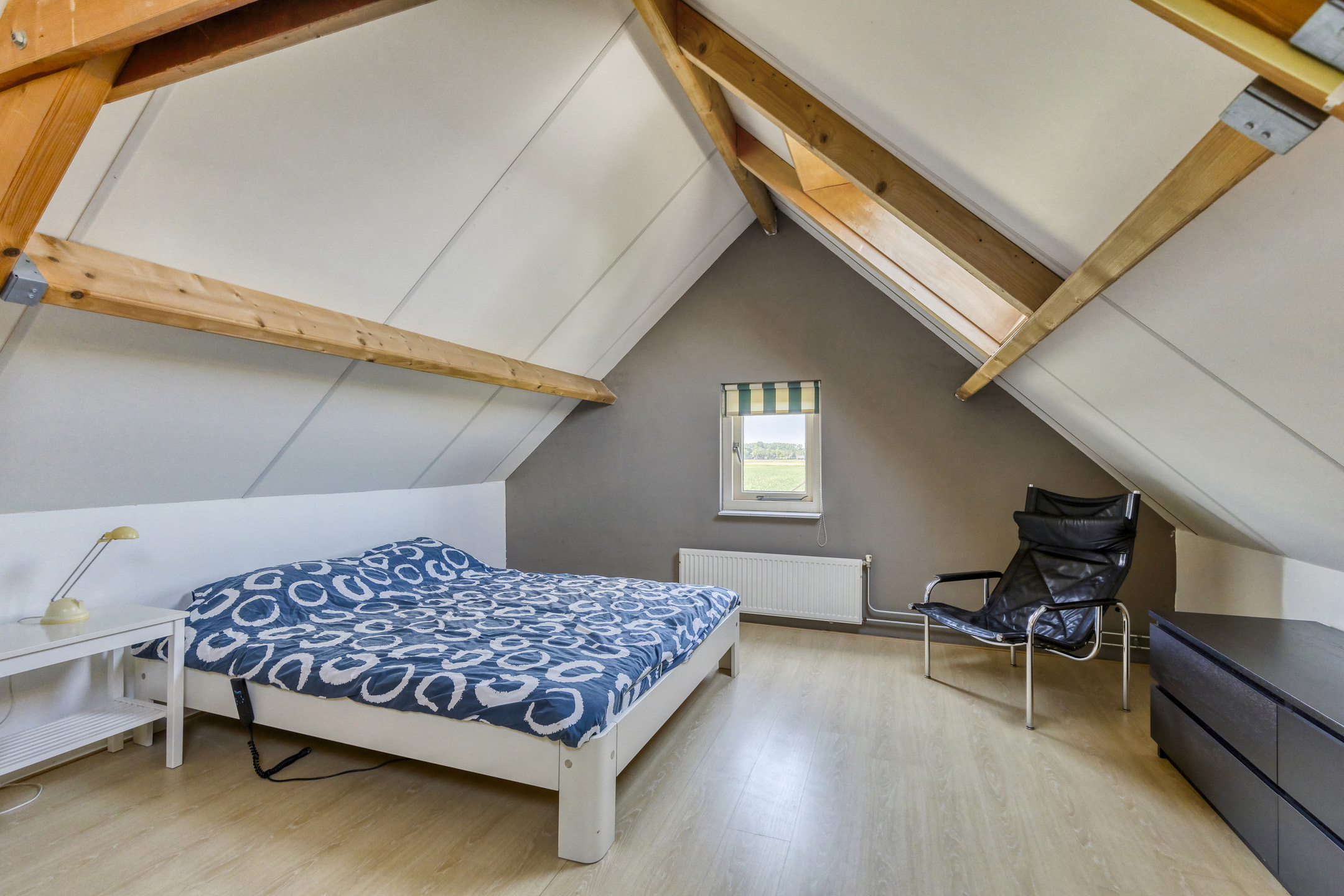 Bergzolder, houten vloer, dakplaten in het zicht.