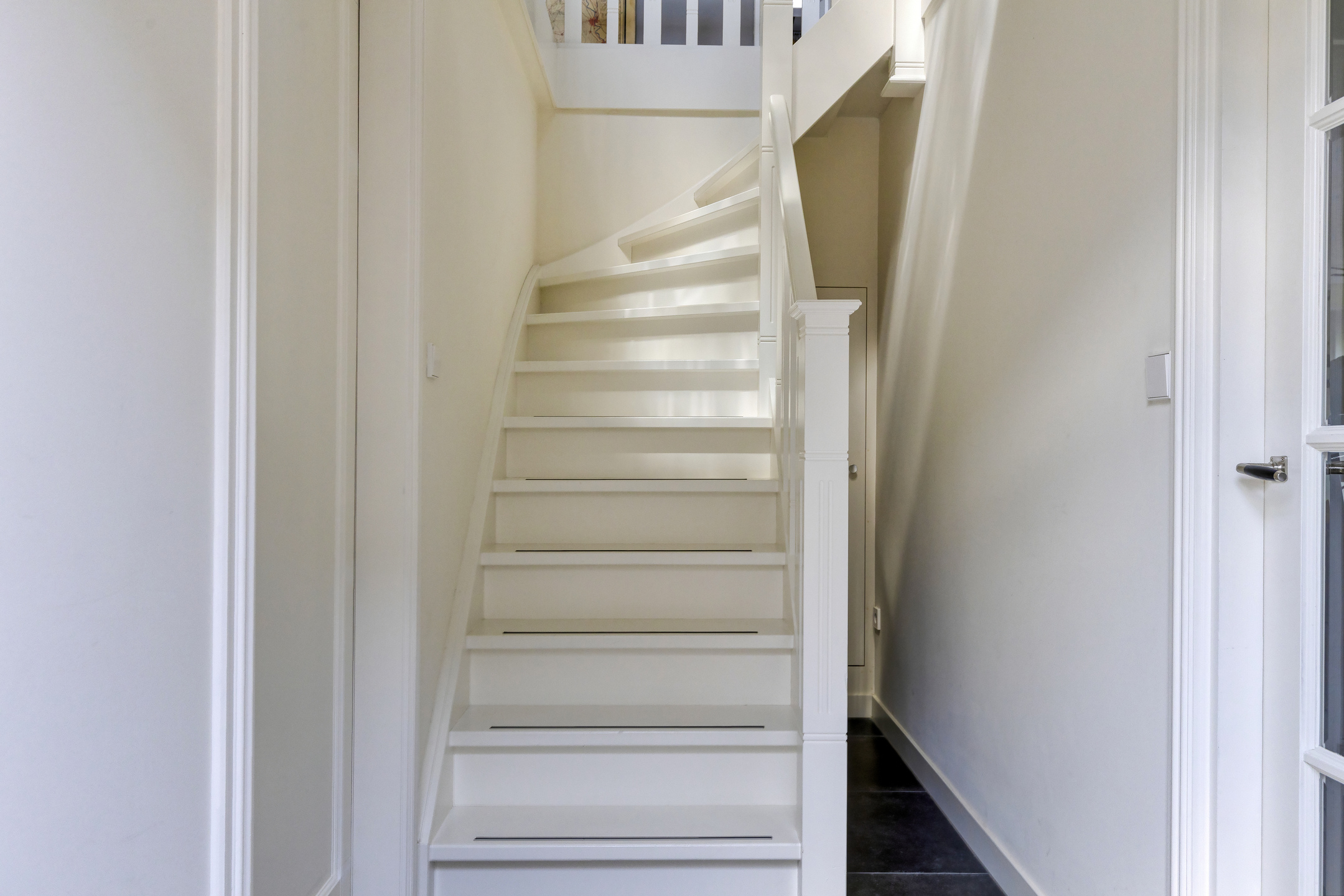 vanuit de tussenhal een trap naar de 1e verdieping, deur naar tuin/terras en schuifdeur naar bijkeuken en vanuit de hal/entree een trap naar de verdieping boven de slaap-/werk-/hobbykamer.