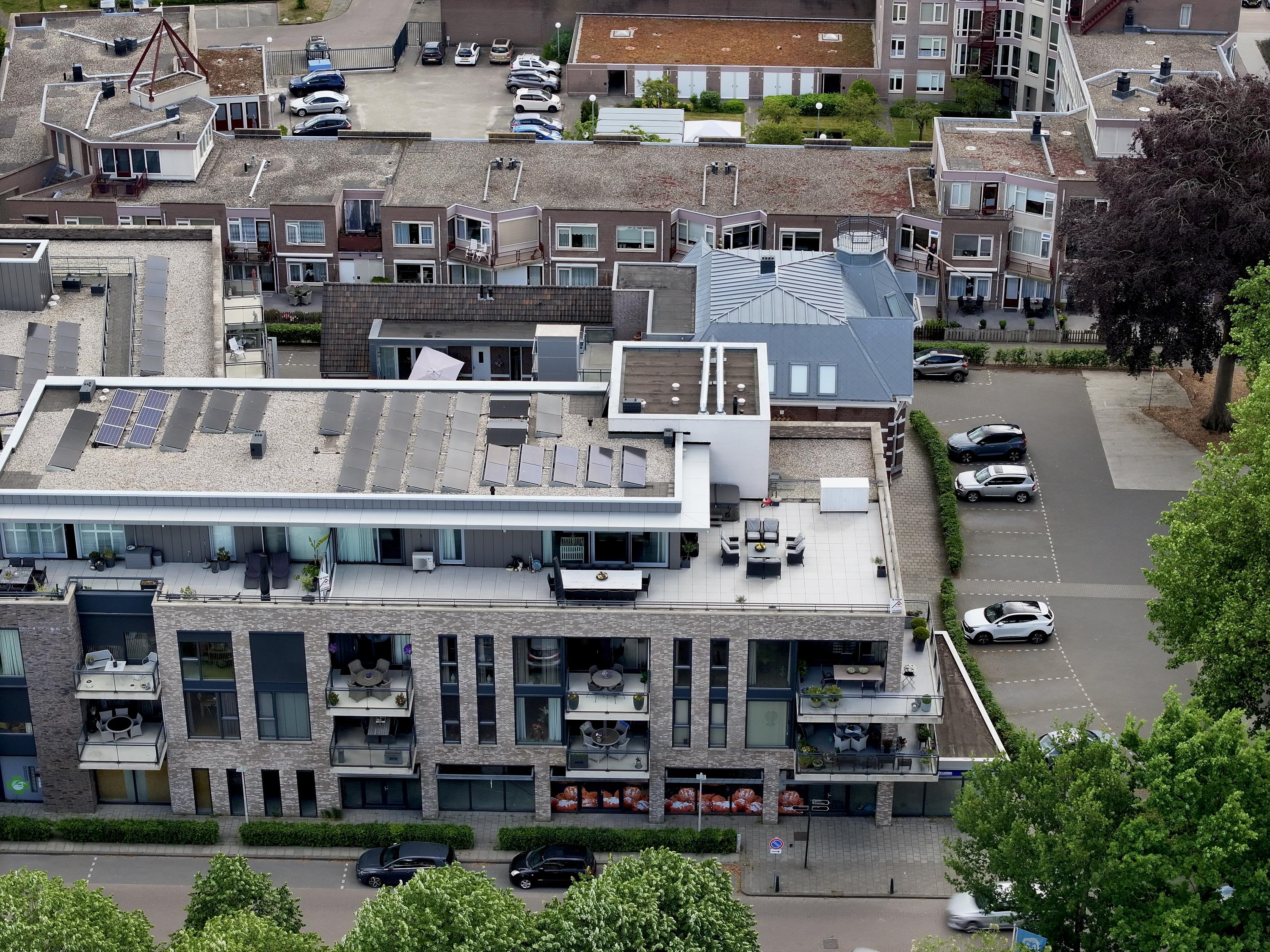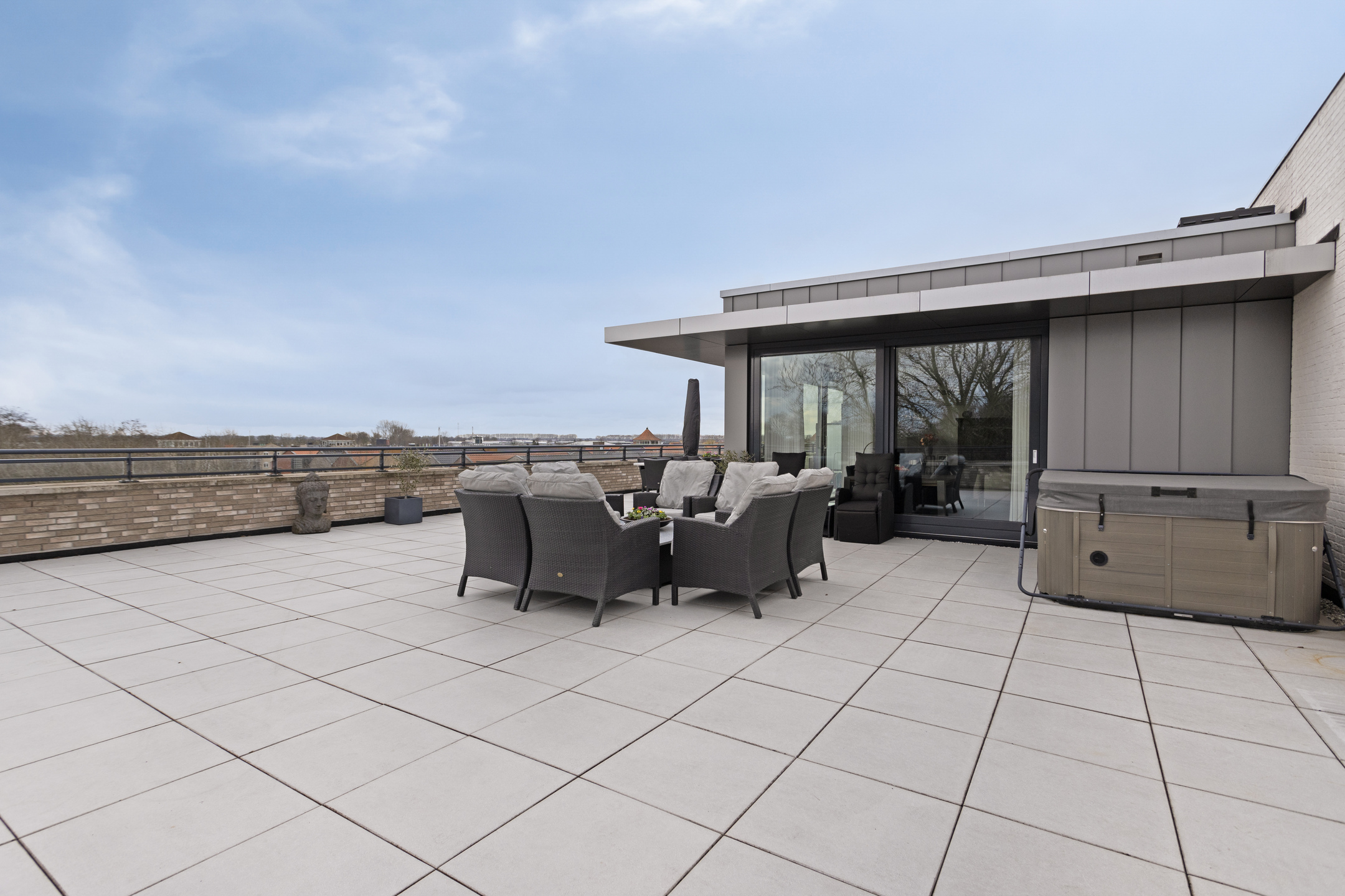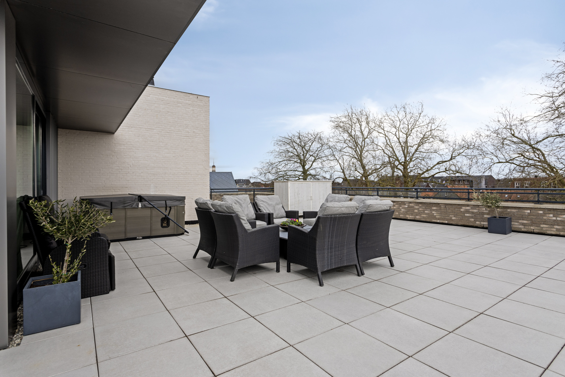 spacious roof terrace of approx 165 m², situated on the sunny west and equipped with various sun and shade angles, ceramic 60x60 tiles, a multi-person Jacuzzi with upper deck (for acquisition), electrical points and an outdoor tap.