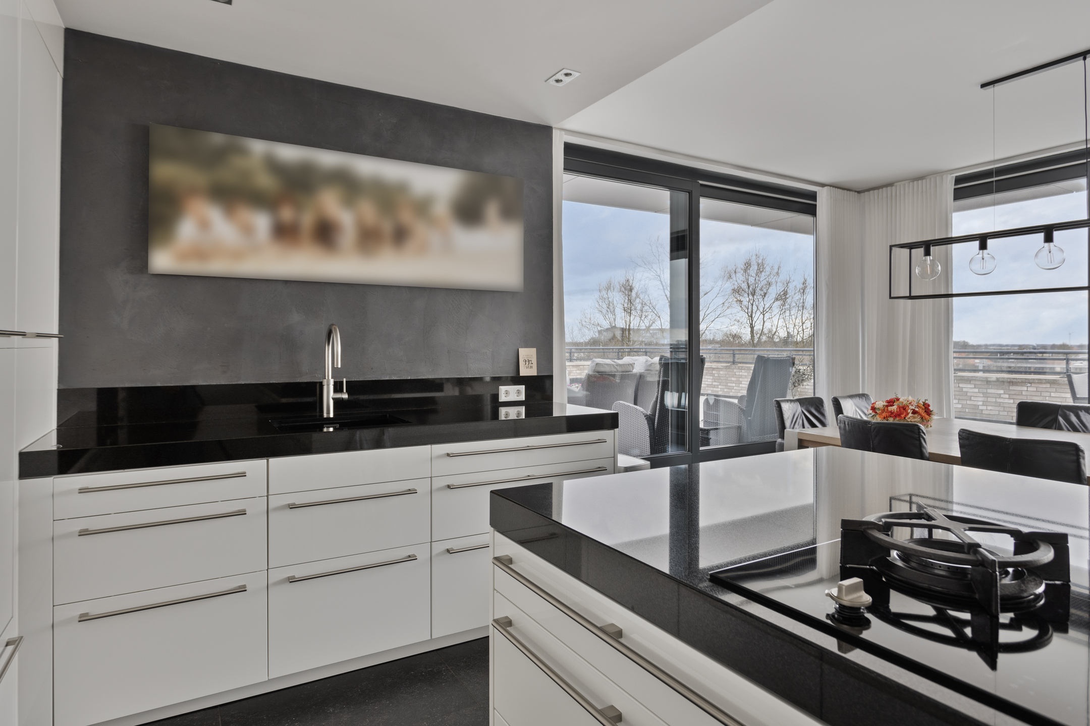 open kitchen with a Poggenpohl custom built kitchen with peninsula and cabinets / appliances wall, top in high quality granite with a sink, built-in induction hob with separate wok burner, built-in fridge / freezer, -2x electric oven, -coffee machine, -high-pressure steam oven, -dishwasher and a ceiling integrated extractor hood, wall finish flat stucco, 80x80 tiled floor, ceiling finished with flat stucco with recessed spotlights;