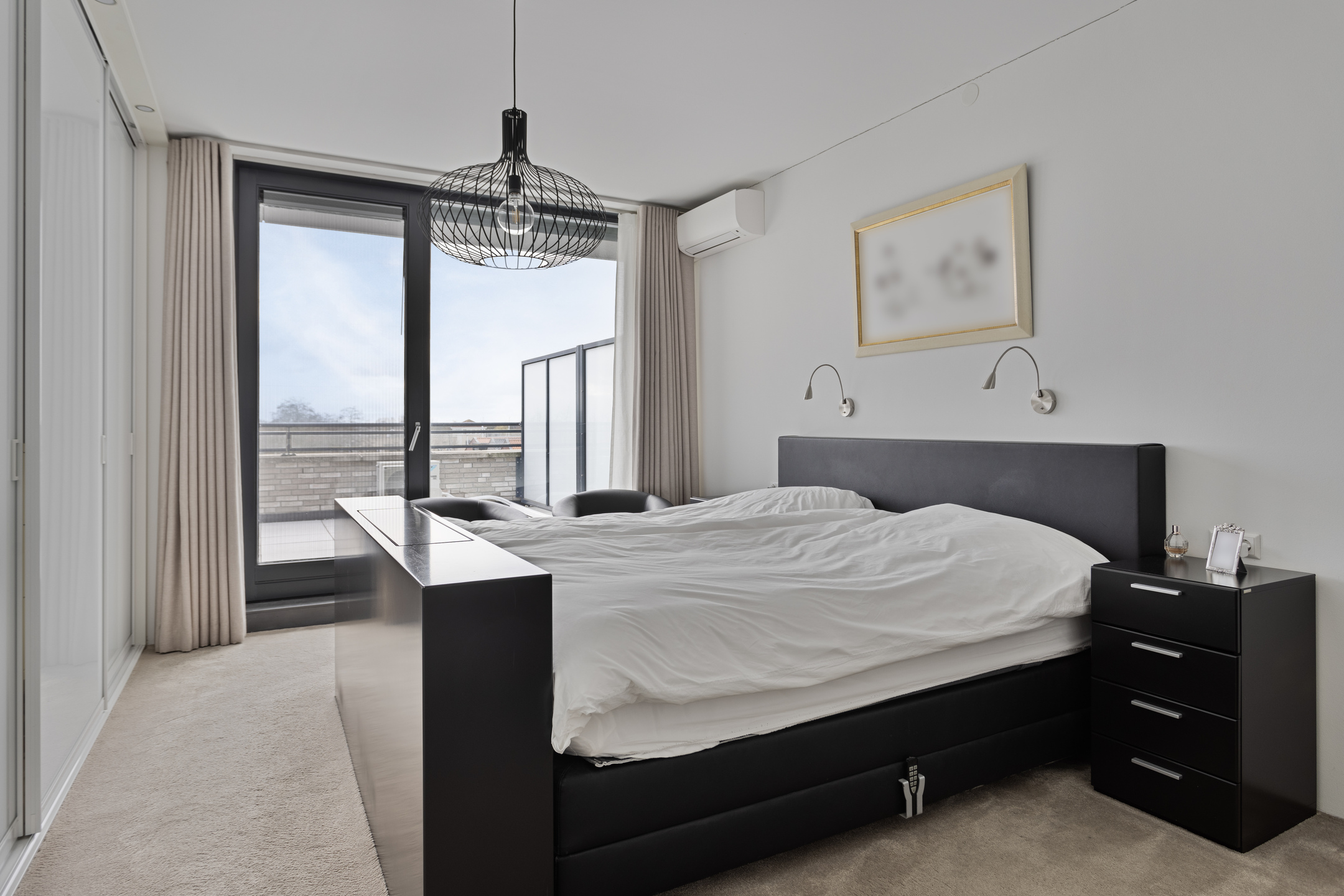 master bedroom (approx. 22.5 m²) with fitted wardrobe and air conditioning, wall finish stucco, floor finished with carpet, ceiling finished with stucco, door to balcony;
