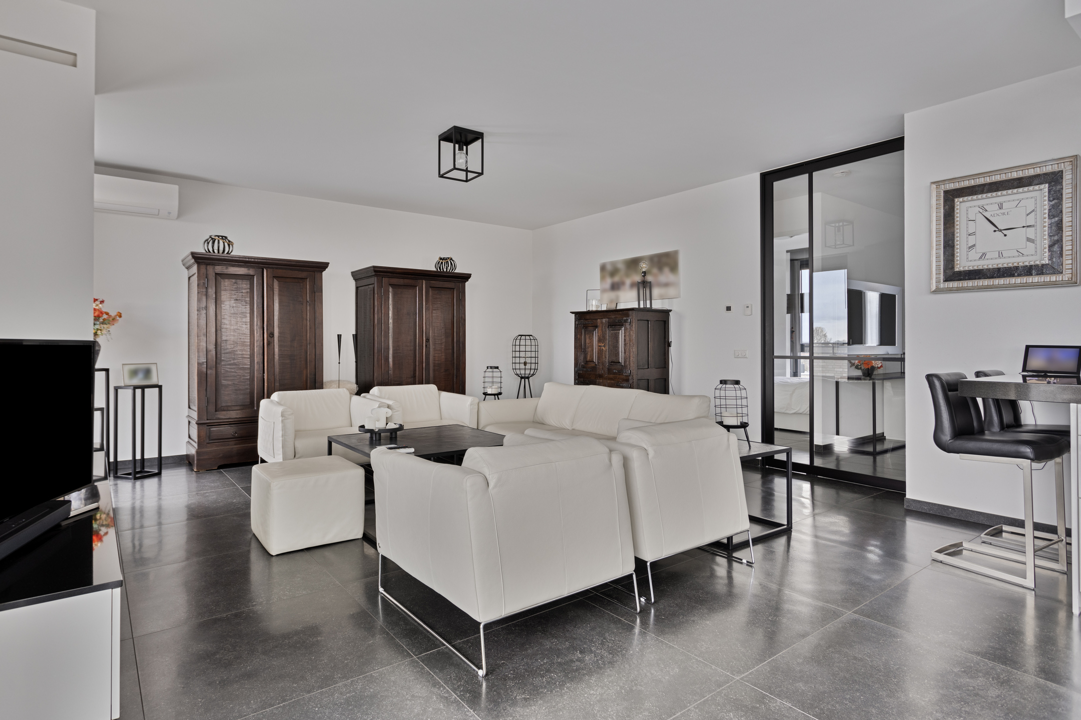 bright living room (approx. 58 m² including kitchen) with a gas fireplace with roof duct, air conditioning, 2 sliding doors and power point in the floor where the seating area, wall finish stucco, 80x80 tiled floor, ceiling finished with stucco;