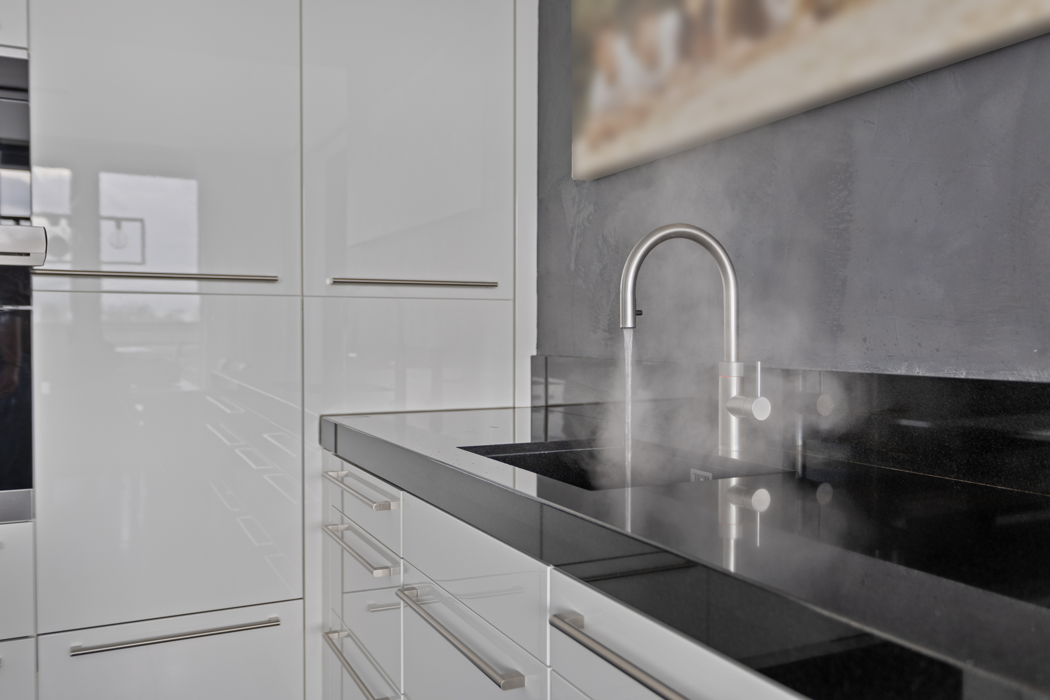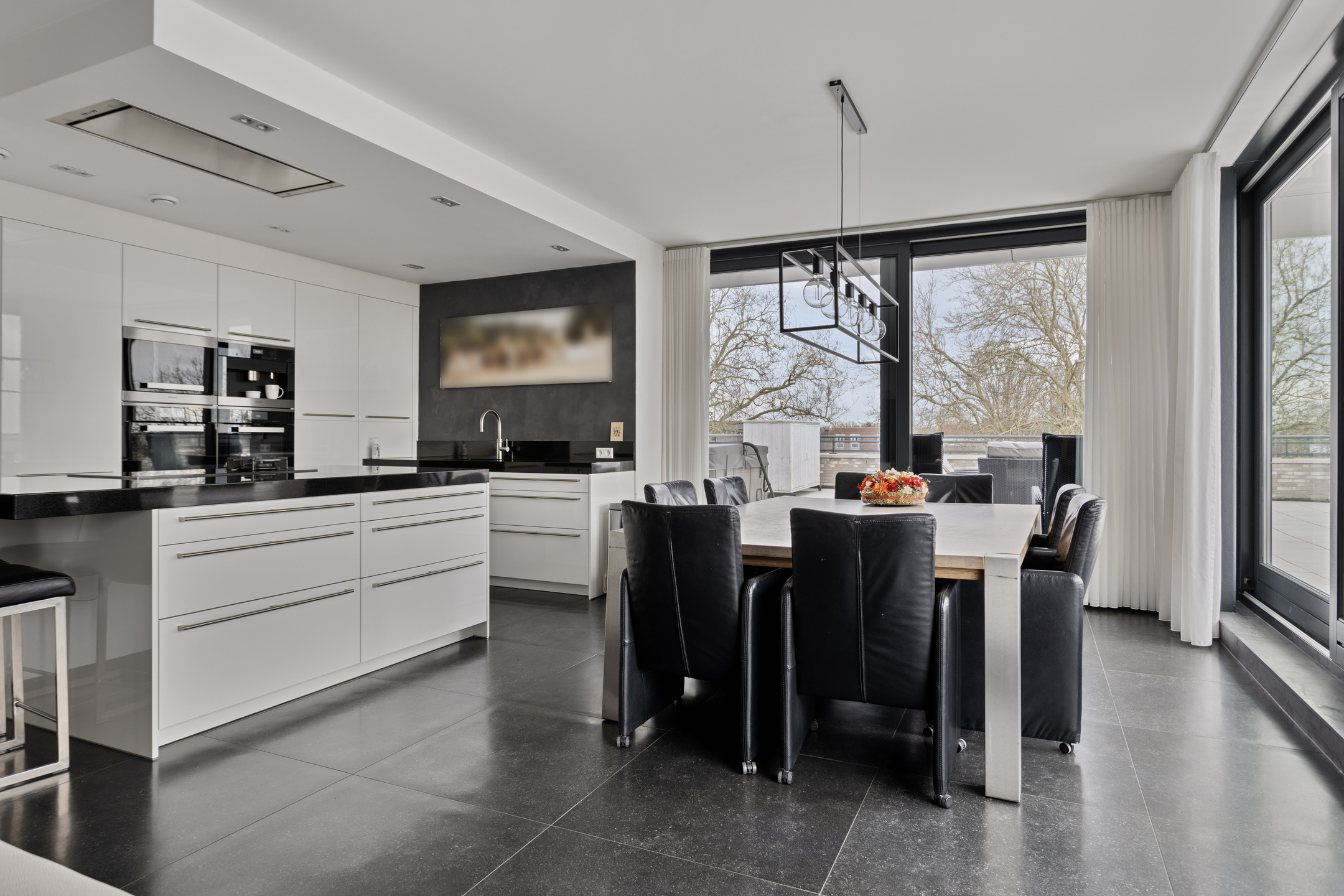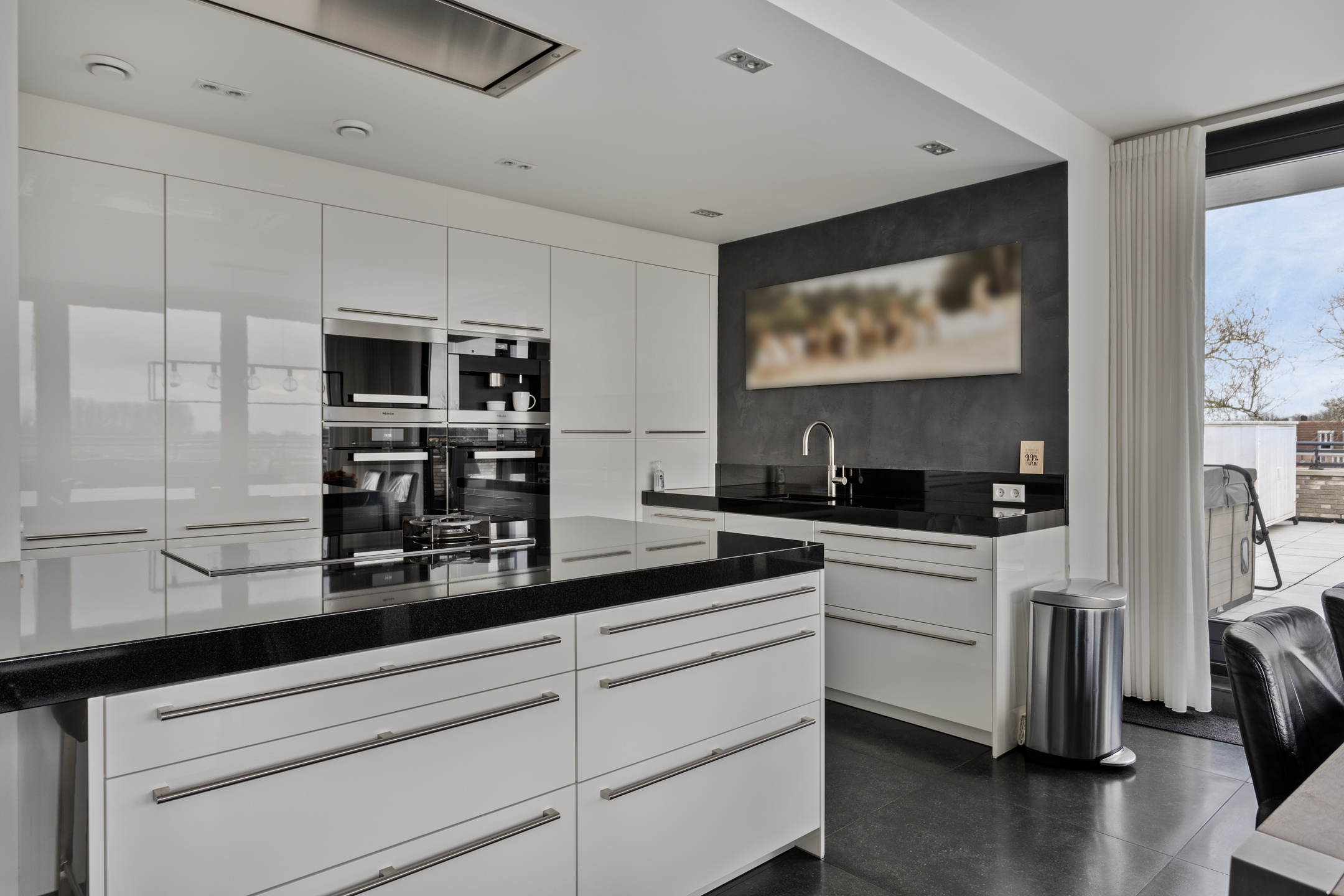 The property features a fine living room with lots of light and direct access to the roof terrace. The kitchen is directly connected to the living room and is a high quality Poggenpohl kitchen with luxury appliances including a high-pressure steam oven, the galvanized hood with direct outdoor extraction, a Quooker and of course a granite worktop.