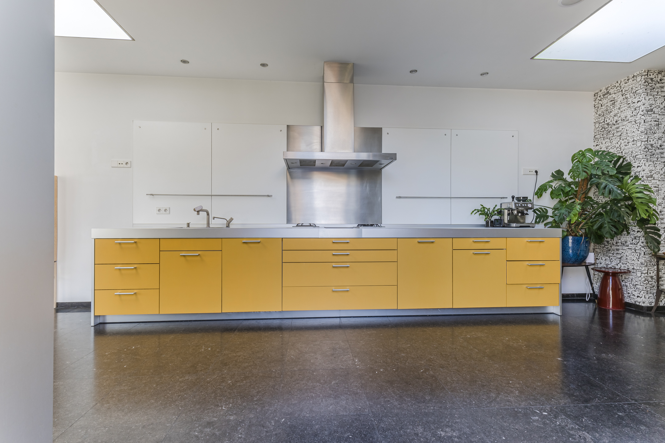 The modern, luxurious kitchen is both stylish and functional, offering generous space and beautiful views of the garden—perfect for relaxed dining. The kitchen is equipped with built-in appliances including a ceramic oven, combination oven-microwave, steam oven, American-style fridge (with water connection) and a Quooker tap. Provisions are also in place for a built-in coffee machine.