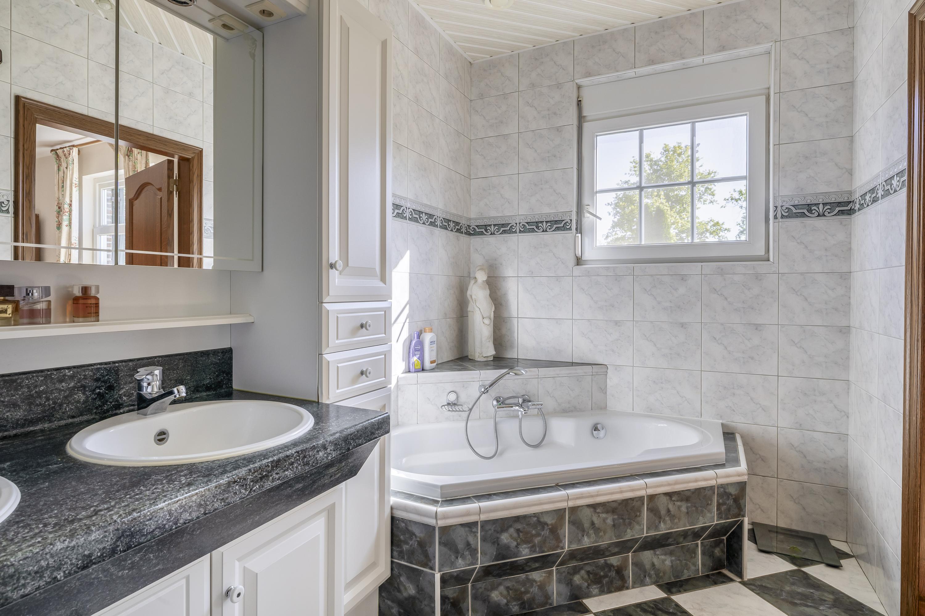 staircase provides access to the first floor. The spacious living room is a wonderful space. The large windows and sliding doors offer a beautiful unobstructed view of the garden. The wooden beamed ceiling and the fireplace with gas stove add extra atmosphere to the room. There is also air conditioning. The kitchen is corner-shaped and equipped with a dishwasher, sink, ceramic hob, oven, microwave and refrigerator. The windows from the kitchen also offer a view of the garden. The utility room is partially tiled and equipped with connections for washing appliances. A door provides access to the back garden. The bathroom is fully tiled and equipped with a bathtub, a double sink with cabinet and a designer radiator. The bedroom is adjacent to the bathroom.