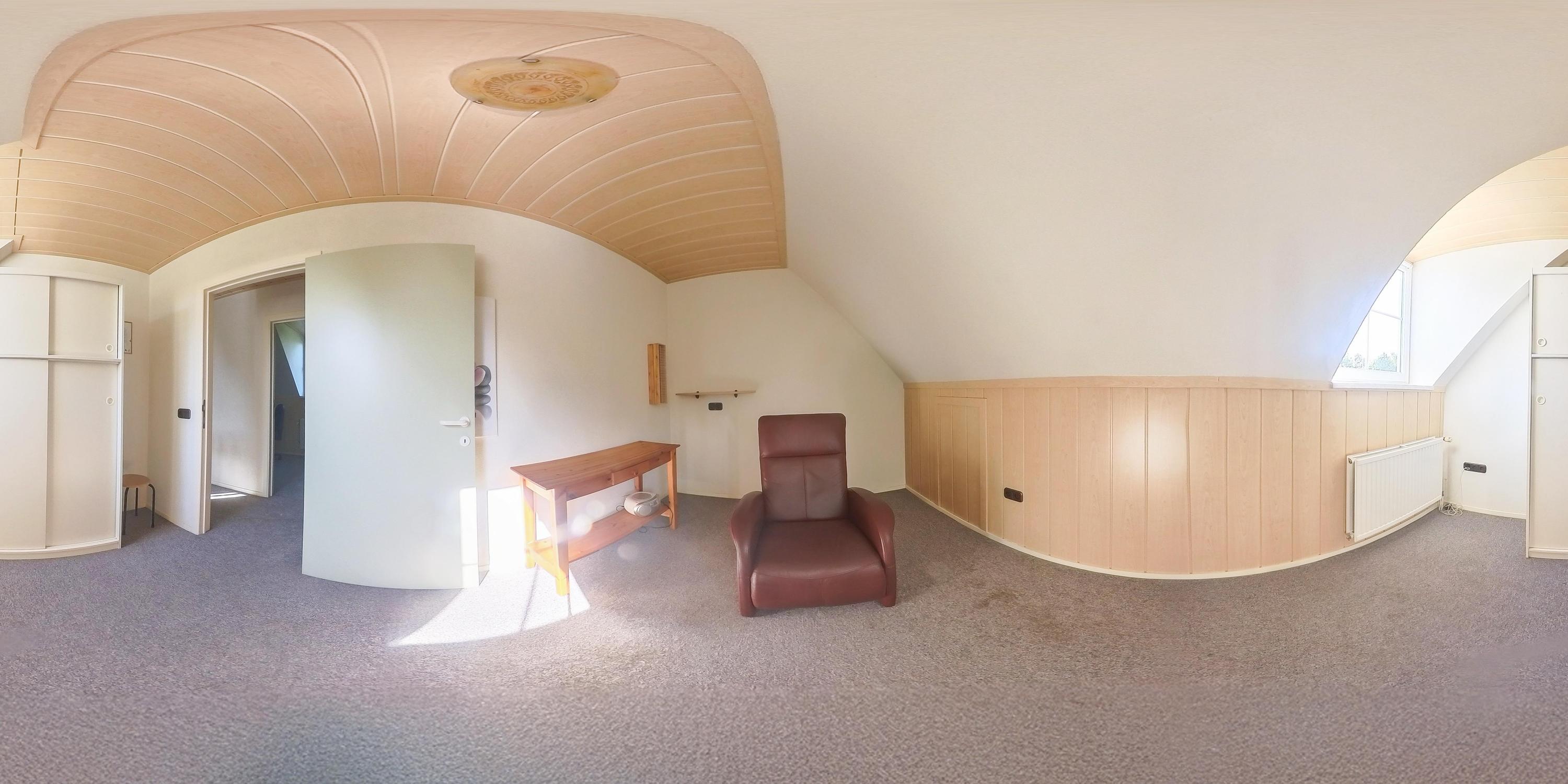 The first floor has three bedrooms, a bathroom and an attic space. All bedrooms and the attic space are carpeted. Windows provide natural light and ventilation. Storage space has been created under the sloping roof. The attic space is equipped with the central heating boiler (Vaillant) and a vacuum system. A hatch provides access to the loft.