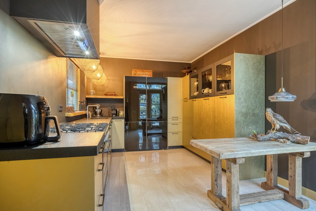 The live-in kitchen is modern and fitted with luxury appliances such as a large gas stove, a canopy extractor, dishwasher, fridge and freezer, air conditioning and a Quooker tap. Here you cook with a view of the garden, while natural light beautifully glides across the kitchen’s golden fronts. The conservatory and back garden can also be accessed via the kitchen. Adjacent, you reach on one side the practical utility room with laundry connections, and on the other a very spacious bedroom with an equally spacious walk-in closet and an en-suite bathroom. Sliding doors connect the bedroom to the garden, and the garden can also be easily reached via the walk-in closet. The generous bathroom features light tiling and a skylight, a whirlpool bath, double vanity, walk-in shower, wall-hung toilet and plenty of storage space.