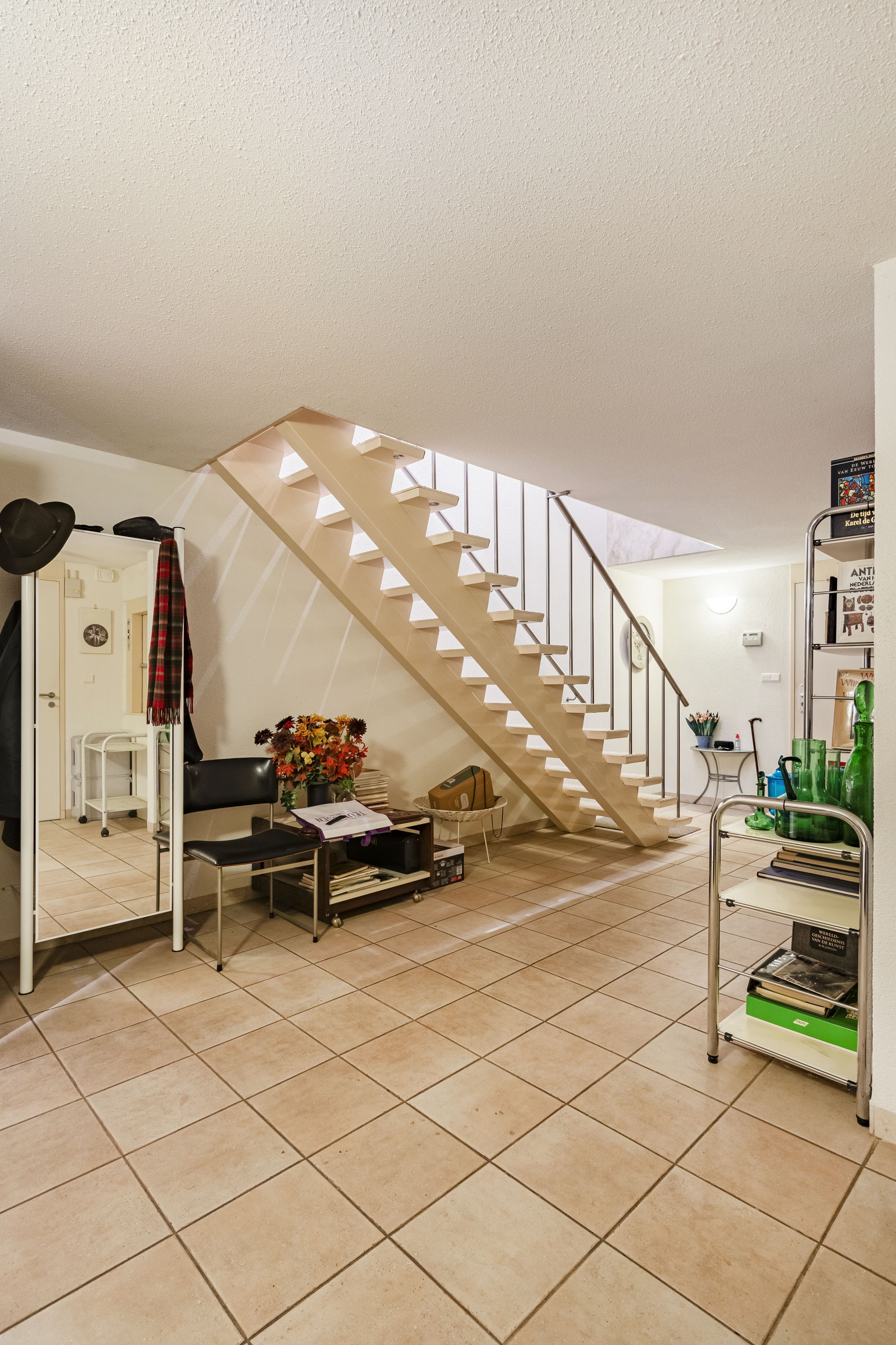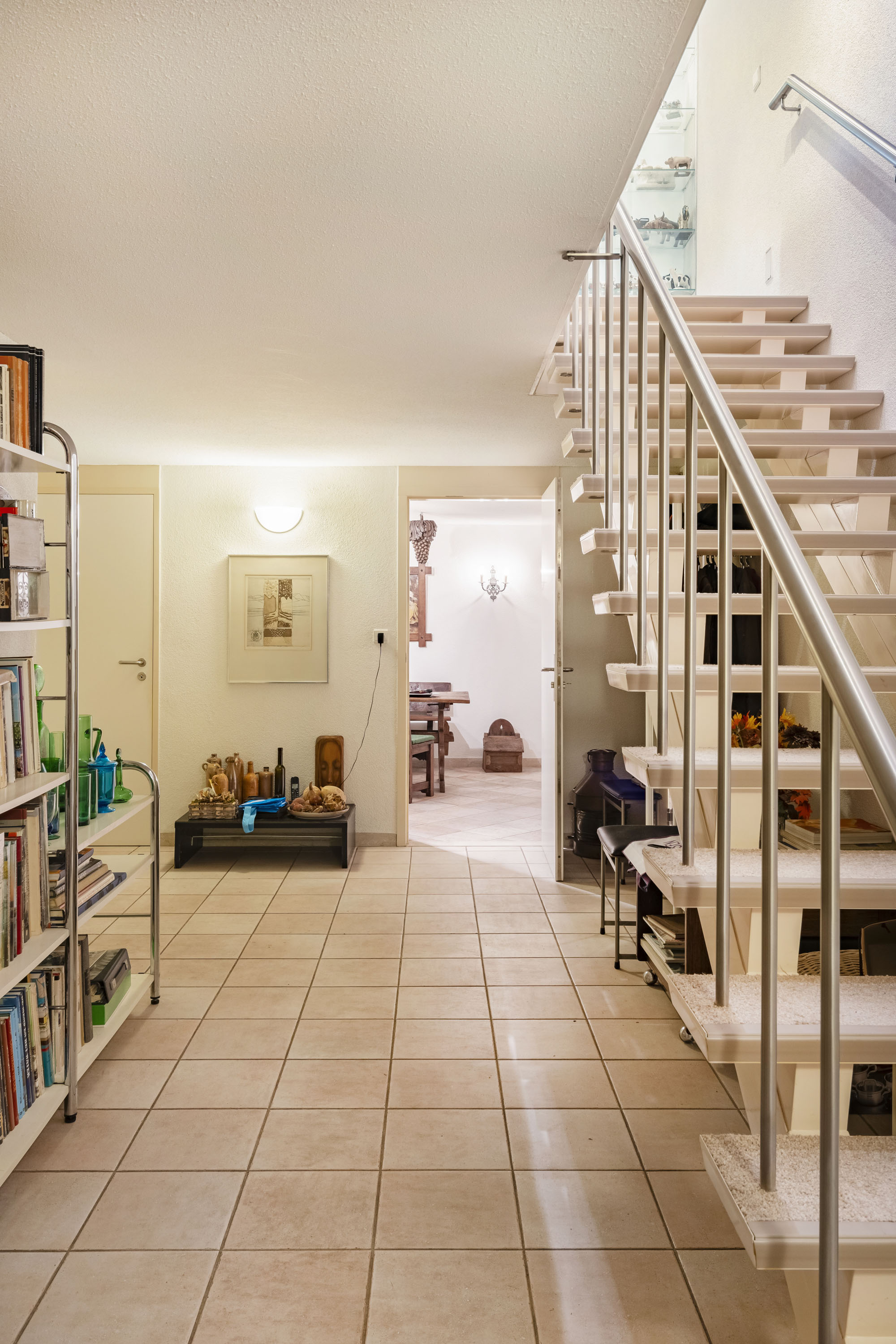 This spacious basement includes a large garage with space for two cars, an electric door, and a charging station for an electric vehicle. There is also a beautiful wine cellar, several storage rooms, a technical room housing the heat pumps for both the house and the indoor pool with jet stream. Residents can access the house directly from the basement.