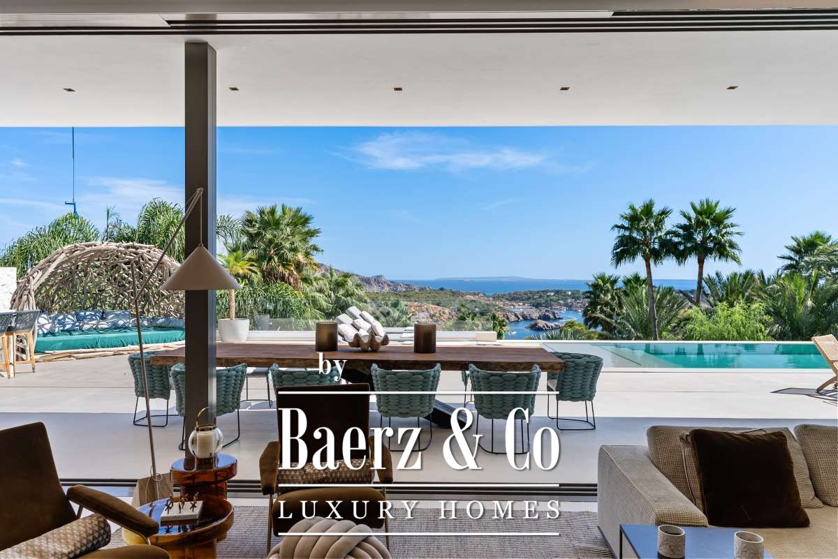 The surroundingsThe masterpiece ‘Villa Z’ is the epitome of luxury living; an ultra-modern and luxurious property located in the exclusive gated urbanization of Vista Alegre in Es Cubells. With the gated community's 24/7 security, cameras and limited access for residents and their guests, privacy and safety are guaranteed. This area is undoubtedly one of Ibiza's most sought after locations for luxury residences and is characterized by its ultra-private properties. This exclusive villa offers breathtaking sea views, some say the best panoramic vistas on the island. Beach lovers will be spoiled for choice, the island's magical southwestern beaches are renowned for their sandy beaches, crystal clear blue waters and world famous beach clubs and seafront restaurants. A 5-minute drive takes you to the idyllic and secluded Playa de Es Cubells, the closest beach to the property. For those seeking lively beachside sophistication, a 15-minute drive leads to Cala Jondal, home to prestigious beach clubs such as Blue Marlin, Jondal, Tropicana and Yemanja. Discover more idyllic and unspoilt beaches at nearby coastal gems such as Es Xarcu, Es Torrent, Cala D'Hort and Cala Llentrisca. The charming town of San Joseph is just a 12-minute drive away and offers all daily necessities and conveniences, from supermarkets and doctors to shops, restaurants and bars. When looking for a taste of vibrant city life, Ibiza Old Town is just 25 minutes away. Traveling is easy and convenient as the airport can be reached in just 20 minutes. Surrounded by lush nature and premium views of the Mediterranean sea, Las Salinas, and the magical island of Formentera, this exquisite estate is the perfect place to call home where peace, privacy and an abundance of luxury come together.The villaThis exclusive ultra-modern mansion with 8 bedrooms and 12 bathrooms, offers an unparalleled luxurious living experience with 1.027m2 of built area on a generous 2.939m2 plot. Be prepared to be awed by 4 levels of extravagance, accessible by your own private elevator. Step through an elegant golden massive gate to enter the premises. The front door of the villa is decorated with gold and luxurious Carrara marble, welcoming you with elegance and extravagance. Step into the opulent open plan living, dining and kitchen space with a modern fireplace and first-class sea views. Impressive sliding glass doors open completely automatic all the way to the expansive terrace, seamlessly blending indoors and outdoors for a perfect luxury open-air living experience. The state-of-the-art kitchen is a culinary heaven, equipped with a galore of premium appliances such as three ovens, two wine refrigerators and multiple cooking options including gas burners, grill and induction cooktop. On the right wing of the main floor, you will find two beautiful bedrooms with en-suite bathrooms. Ascending to the first floor, the master bedroom awaits with a modern fireplace, a stunning walk-in closet, a private roof terrace access and an ultra-luxurious en-suite bathroom, complete with his and hers sinks, a freestanding bathtub with mesmerizing views, and separate toilet for the ultimate comfort. Lavish details of Carrara marble tiles and golden accents adorn all twelve bathrooms throughout this magnificent estate. On the -1 level you will find three additional bedrooms, all with luxurious en-suite bathrooms, terrace access and offering views over the garden, pool and Mediterranean sea. On this floor you also will discover a world of first-class entertainment and relaxation. Find a wine cellar that is completely dedicated to red wines and maintained at the perfect temperature of 16 degrees. Continue your way to an exclusive private club with a dark marble bar, cinema screen, lounge area, a separate guest toilet, an ice machine, and soundproofing, all setting the stage for unforgettable entertaining experiences. Further on this floor of leisure heaven, you will find a luxurious