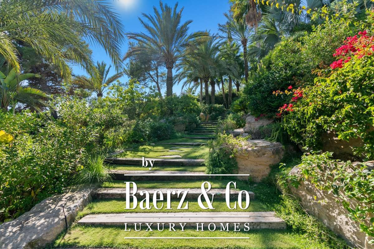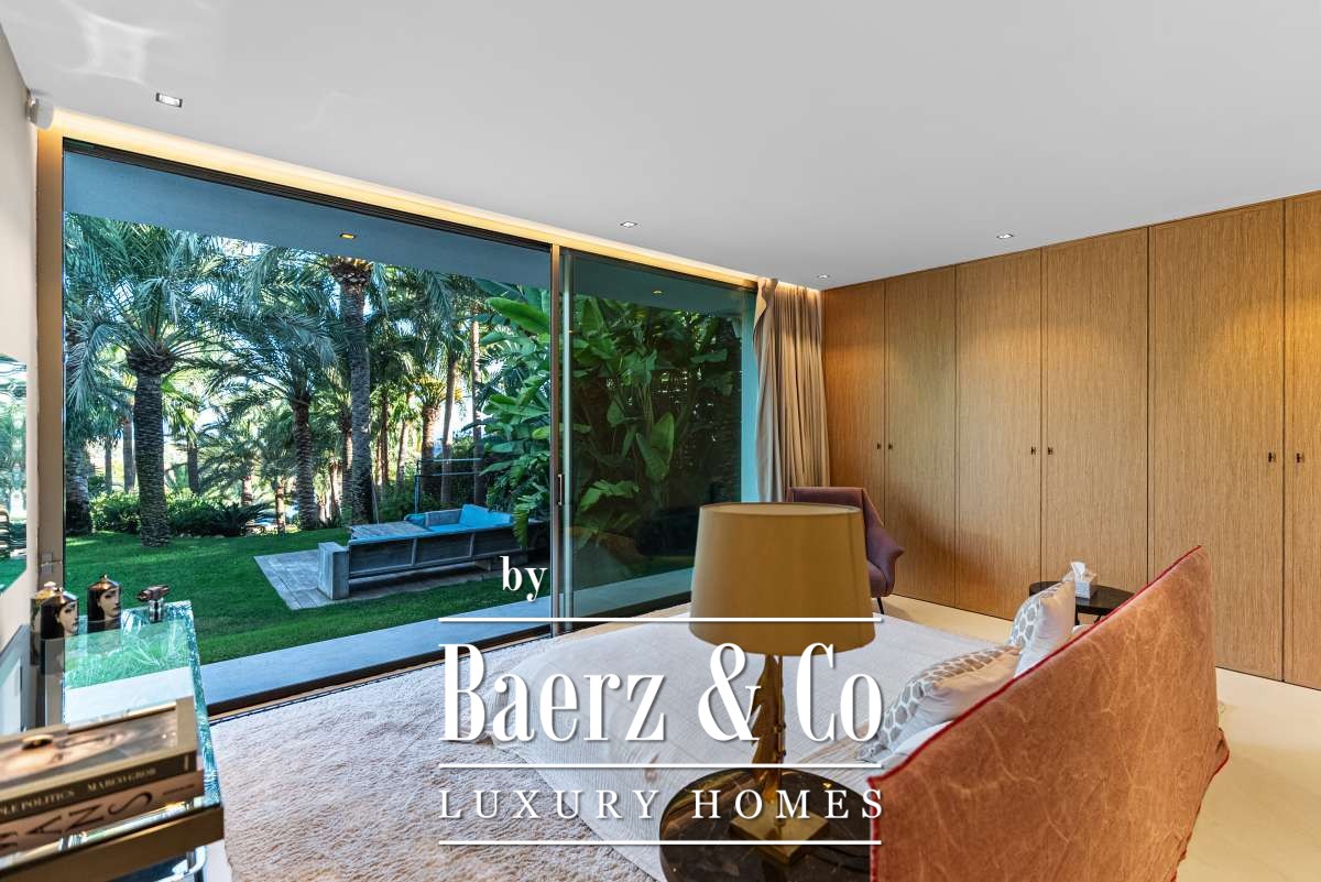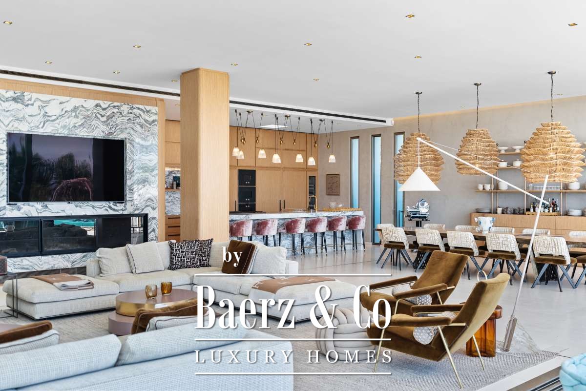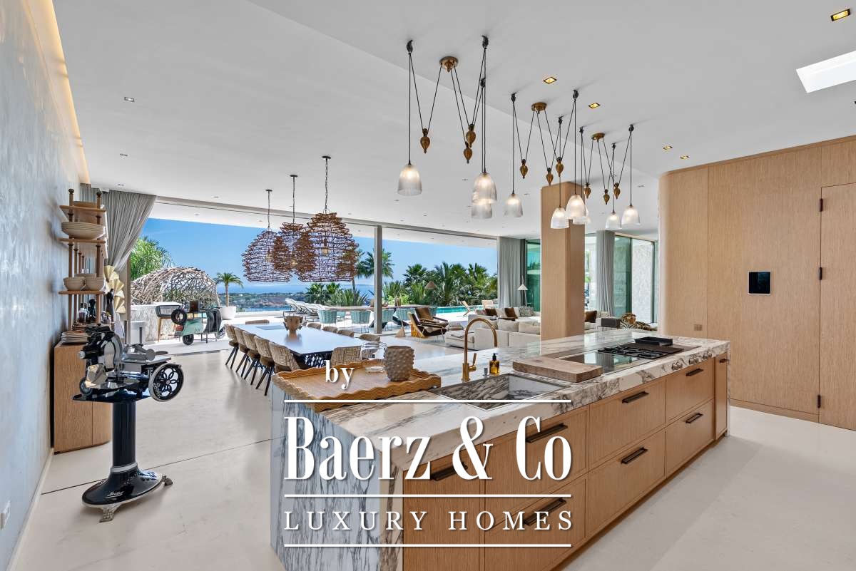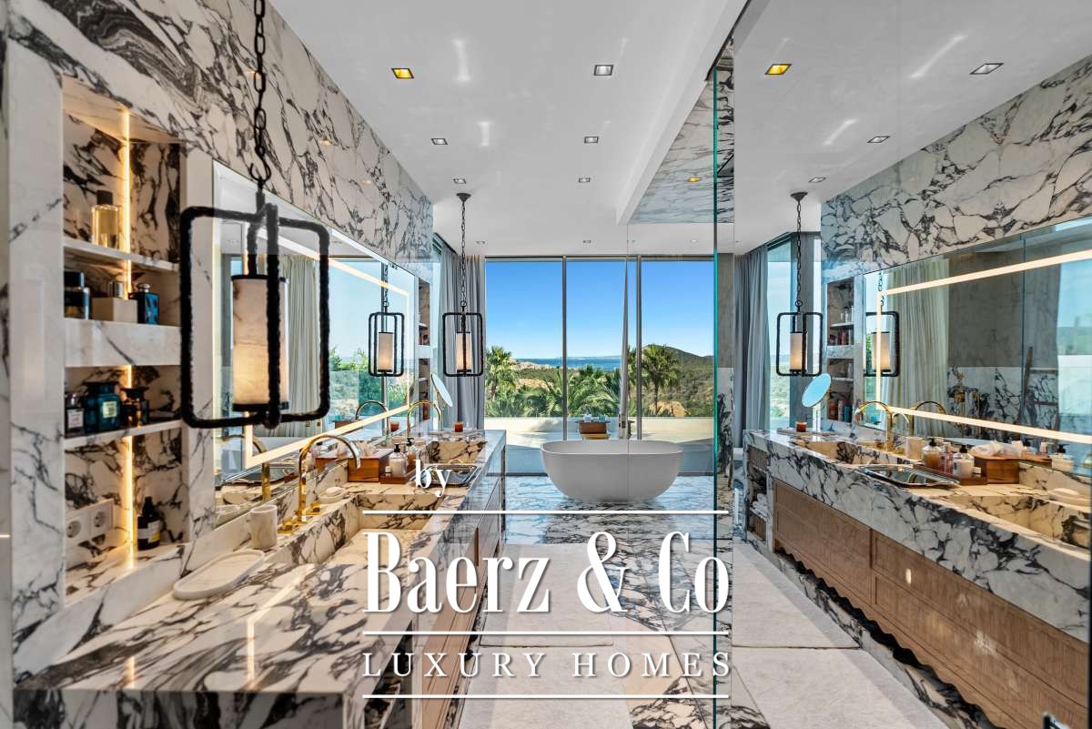 spa retreat with a serene massage table, salon chairs for mani-pedi, glam hairdressing and make-up tables, a shower, and on top of that there is a marble relaxing sauna spa with a thermal jacuzzi bath. The souterrain -2 level is reachable by a modern elegant staircase that looks at the glass window framing the pool from the living room terrace. This floor also offers an exquisite and fully-equipped modern gym featuring an all-glass wall with captivating views of the pool and garden. This level also contains two en-suite bedrooms, ensuring utmost privacy for you and your guests. Furthermore, there is also a separate fully equipped guesthouse that can be reached through a separate entrance. Experience the latest, cutting-edge smart home features powered by the state-of-the-art Gira system and control your entire house easily with an app; from electric window coverings with mosquito nets to lighting, curtains, weather predictions and music. Prioritizing your safety and peace of mind, this property is equipped with an advanced integrated camera system.The outdoor spacesThe outdoor areas of this immense estate are unreal; whether you enjoy the garden with pool number one, the spacious terrace lounge with pool number two, or the relaxing rooftop lounge with breathtaking panoramic views. The villa is surrounded by a royal lush garden with an array of flora, fauna and towering palm trees, creating a private and secluded oasis. In addition to the grandeur garden, the villa has many terraces to choose from, each with its own character and views. Ascend to the roof and enjoy a fascinating 360-view over the hills, the valley, the Mediterranean Sea, Salinas and Formentera, which you can enjoy from a large integrated chill-out sofa, surrounded by charming cactus gardens. The terrace on the ground floor features tropical plants, sunbeds, an extensive outdoor kitchen with barbecue and bar and a large captivating infinity pool, making this terrace the perfect setting for relaxing in your private resort. A luxe glass waterfall connects this pool to the garden level pool, a mesmerizing feature that transforms this home into a visual masterpiece. In the lush green garden you will find the beautifully designed swimming pool. With a large integrated lounge area as the centerpiece, surrounded by the crystal clear blue water of the pool, and the sound of a relaxing waterfall in the background, this unique eyecatcher provides the perfect spot for cherished get-togethers with friends. After a dip in the refreshing swimming pool, step into the large jacuzzi to relax, hidden between tropical plants. Stroll through the lower garden to reveal an array of citrus and tropical fruits, including orange, lemon, mango and pomegranate plantations. This is also where the younger members of the household can play in a jolly children's play area. Next to the lower garden, an extra winter garage is being constructed, offering a safe and secured space for your precious vehicles. ‘Villa Z’ is not just a home, it is a statement of affluence, a canvas for creating lifelong memories and living extraordinary life at its finest, where every moment is a celebration of the extraordinary.This exclusive ultra-modern mansion with 8 bedrooms and 12 bathrooms, offers an unparalleled luxurious living experience with 1.027m2 of built area on a generous 2.939m2 plot. Be prepared to be awed by 4 levels of extravagance, accessible by your own private elevator. Step through an elegant golden massive gate to enter the premises. The front door of the villa is decorated with gold and luxurious Carrara marble, welcoming you with elegance and extravagance. Step into the opulent open plan living, dining and kitchen space with a modern fireplace and first-class sea views. Impressive sliding glass doors open completely automatic all the way to the expansive terrace, seamlessly blending indoors and outdoors for a perfect luxury open-air living experience.