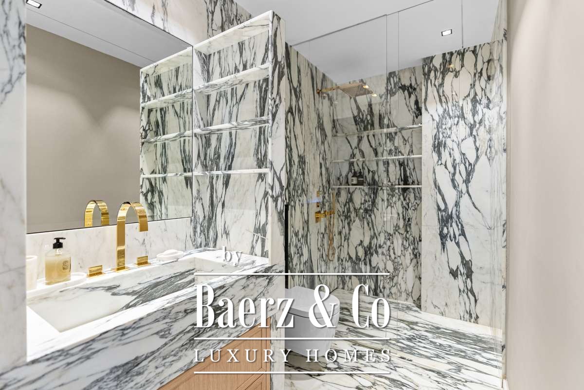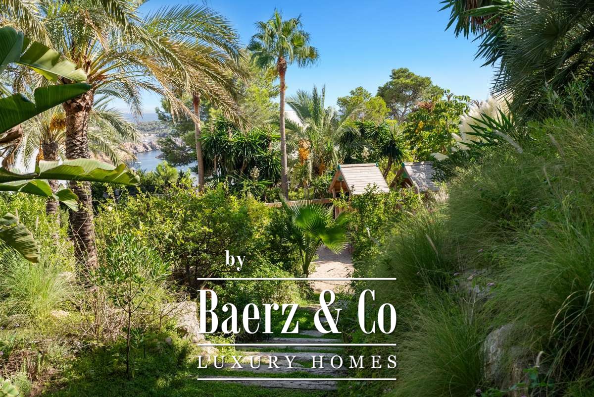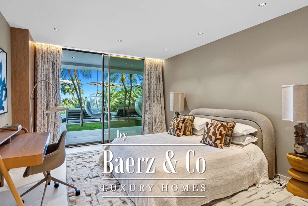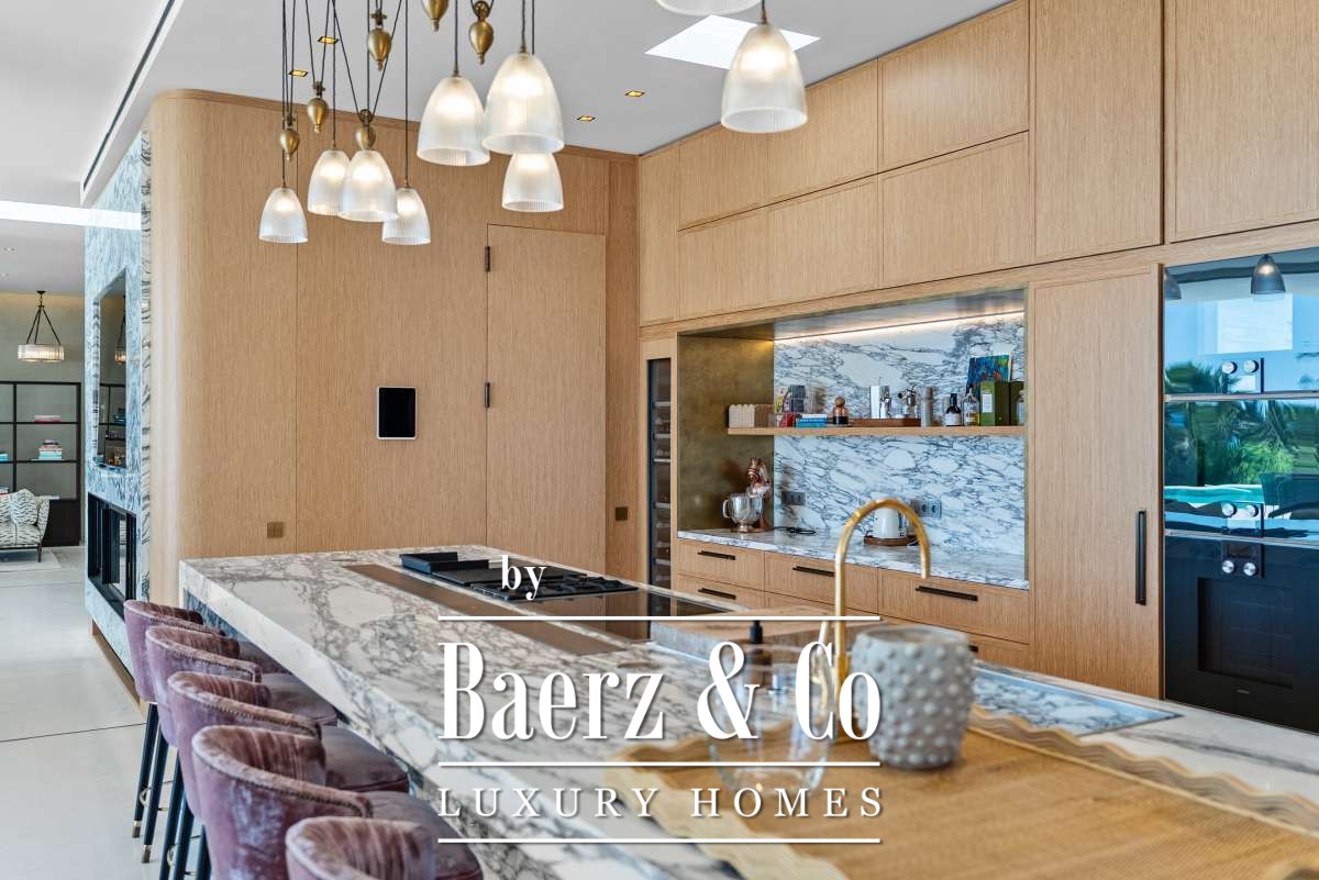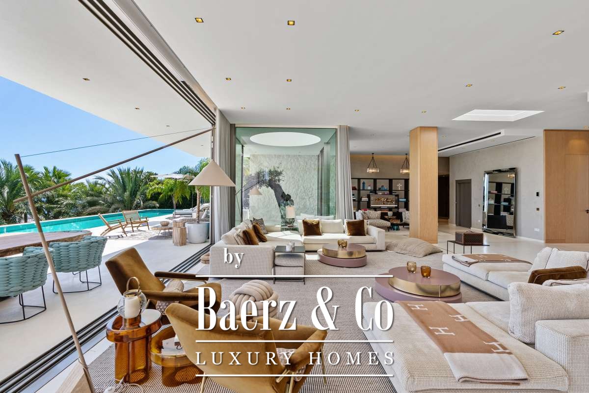 spa retreat with a serene massage table, salon chairs for mani-pedi, glam hairdressing and make-up tables, a shower, and on top of that there is a marble relaxing sauna spa with a thermal jacuzzi bath. The souterrain -2 level is reachable by a modern elegant staircase that looks at the glass window framing the pool from the living room terrace. This floor also offers an exquisite and fully-equipped modern gym featuring an all-glass wall with captivating views of the pool and garden. This level also contains two en-suite bedrooms, ensuring utmost privacy for you and your guests. Furthermore, there is also a separate fully equipped guesthouse that can be reached through a separate entrance. Experience the latest, cutting-edge smart home features powered by the state-of-the-art Gira system and control your entire house easily with an app; from electric window coverings with mosquito nets to lighting, curtains, weather predictions and music. Prioritizing your safety and peace of mind, this property is equipped with an advanced integrated camera system.The outdoor spacesThe outdoor areas of this immense estate are unreal; whether you enjoy the garden with pool number one, the spacious terrace lounge with pool number two, or the relaxing rooftop lounge with breathtaking panoramic views. The villa is surrounded by a royal lush garden with an array of flora, fauna and towering palm trees, creating a private and secluded oasis. In addition to the grandeur garden, the villa has many terraces to choose from, each with its own character and views. Ascend to the roof and enjoy a fascinating 360-view over the hills, the valley, the Mediterranean Sea, Salinas and Formentera, which you can enjoy from a large integrated chill-out sofa, surrounded by charming cactus gardens. The terrace on the ground floor features tropical plants, sunbeds, an extensive outdoor kitchen with barbecue and bar and a large captivating infinity pool, making this terrace the perfect setting for relaxing in your private resort. A luxe glass waterfall connects this pool to the garden level pool, a mesmerizing feature that transforms this home into a visual masterpiece. In the lush green garden you will find the beautifully designed swimming pool. With a large integrated lounge area as the centerpiece, surrounded by the crystal clear blue water of the pool, and the sound of a relaxing waterfall in the background, this unique eyecatcher provides the perfect spot for cherished get-togethers with friends. After a dip in the refreshing swimming pool, step into the large jacuzzi to relax, hidden between tropical plants. Stroll through the lower garden to reveal an array of citrus and tropical fruits, including orange, lemon, mango and pomegranate plantations. This is also where the younger members of the household can play in a jolly children's play area. Next to the lower garden, an extra winter garage is being constructed, offering a safe and secured space for your precious vehicles. ‘Villa Z’ is not just a home, it is a statement of affluence, a canvas for creating lifelong memories and living extraordinary life at its finest, where every moment is a celebration of the extraordinary.This exclusive ultra-modern mansion with 8 bedrooms and 12 bathrooms, offers an unparalleled luxurious living experience with 1.027m2 of built area on a generous 2.939m2 plot. Be prepared to be awed by 4 levels of extravagance, accessible by your own private elevator. Step through an elegant golden massive gate to enter the premises. The front door of the villa is decorated with gold and luxurious Carrara marble, welcoming you with elegance and extravagance. Step into the opulent open plan living, dining and kitchen space with a modern fireplace and first-class sea views. Impressive sliding glass doors open completely automatic all the way to the expansive terrace, seamlessly blending indoors and outdoors for a perfect luxury open-air living experience.