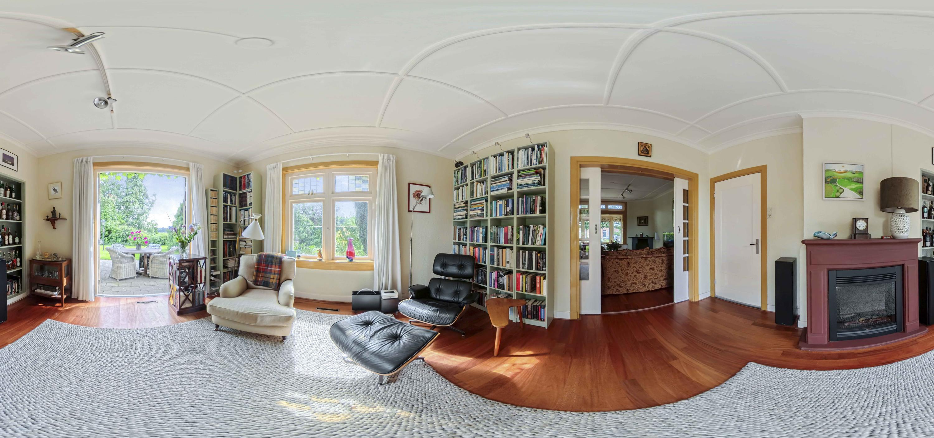 On the right-hand side is a lovely lounge with a fireplace and the conservatory – now used as a music room – with its characteristic pentagonal window and French doors to the garden. En suite is a library with French doors to the rear sun terrace.