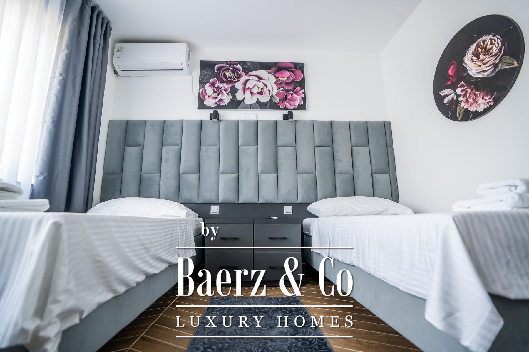 Each house spans four floors, offering a total of 20 bedrooms and 22 bathrooms, designed with generosity of space for large families or extended guest accommodation. The flow of the interiors is balanced by understated luxury, complemented by wellness amenities including an outdoor pool, modern sauna, and jacuzzi.