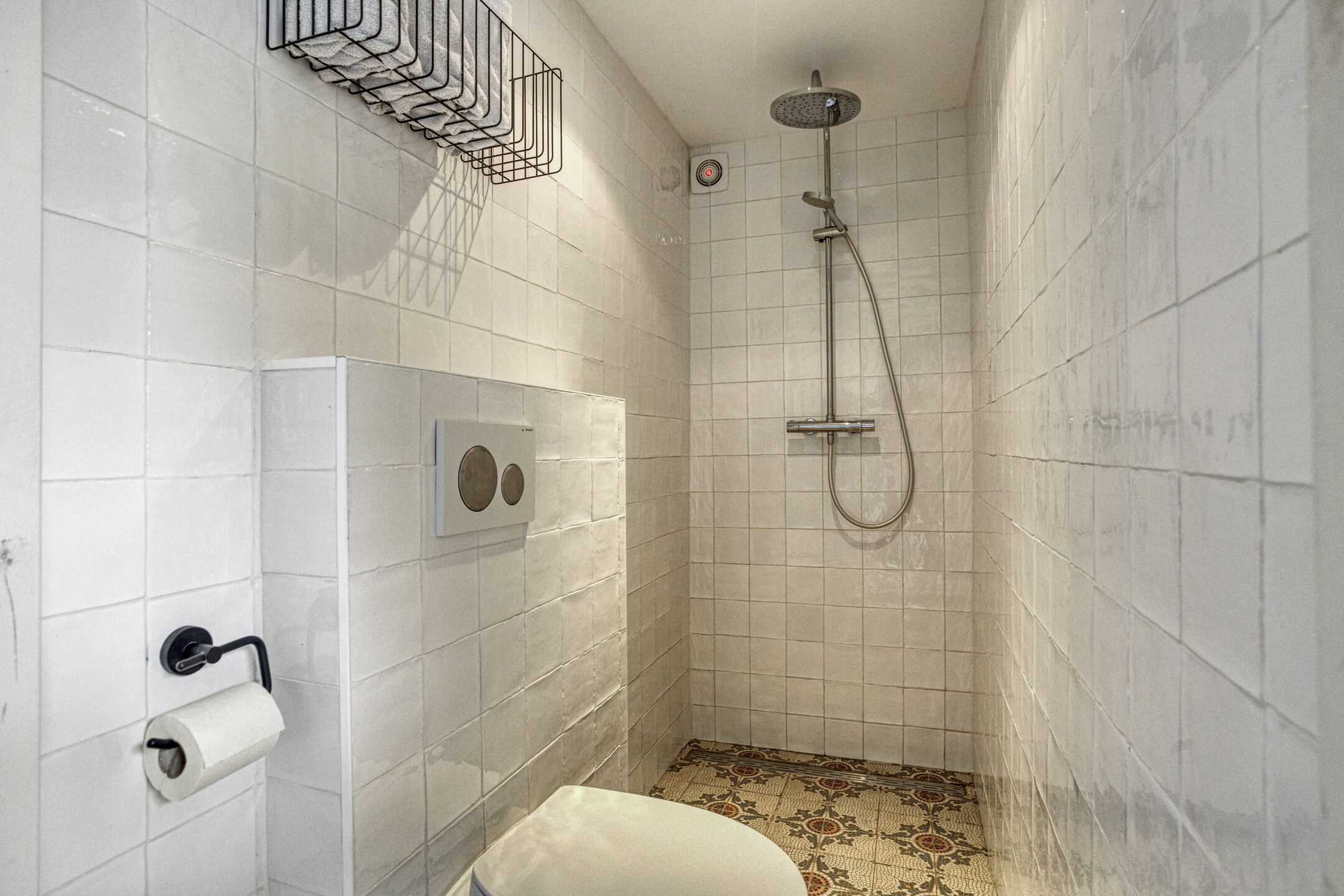 Ground floor: Private entrance from the garden with hall and stairs to the 1st floor. Living room, currently used as a home office, with bathroom with shower and toilet and laundry and cupboard space in the interior to the house.