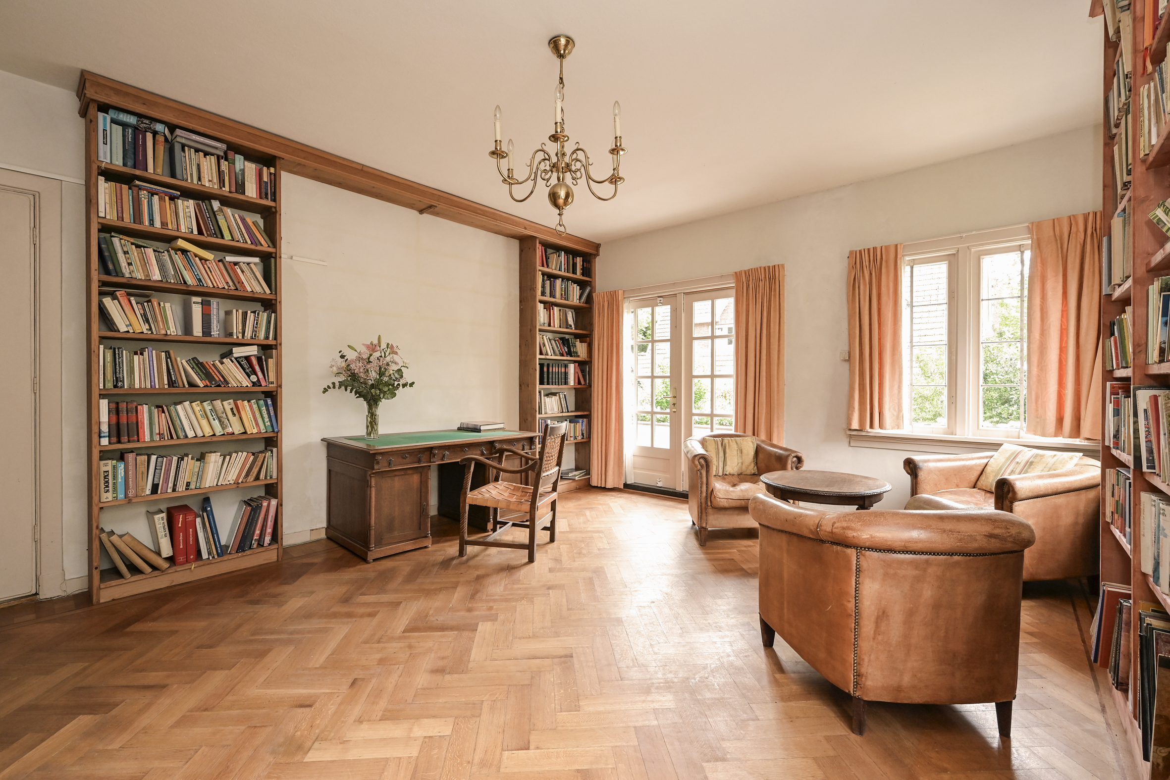 The garden wraps halfway around the house and is very sunny due to its free and open setting. In addition to the original garage, which was once connected to the dining room and could easily be reintegrated into the house, a newer, large garage has been added to the plot. This garage is suitable for many purposes, has an automatic overhead door, and provides passage to the back garden.