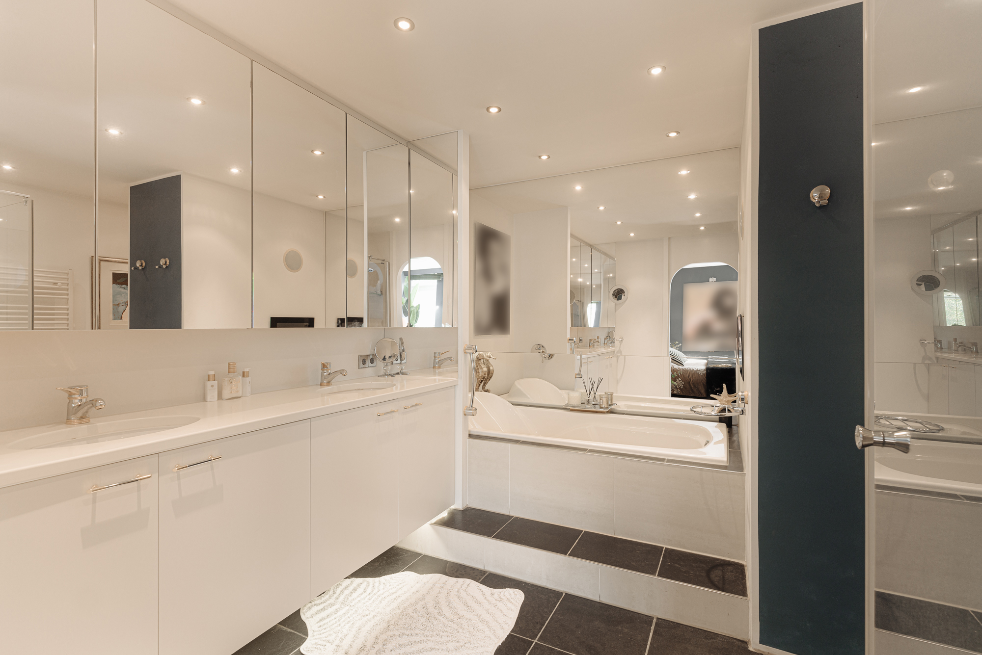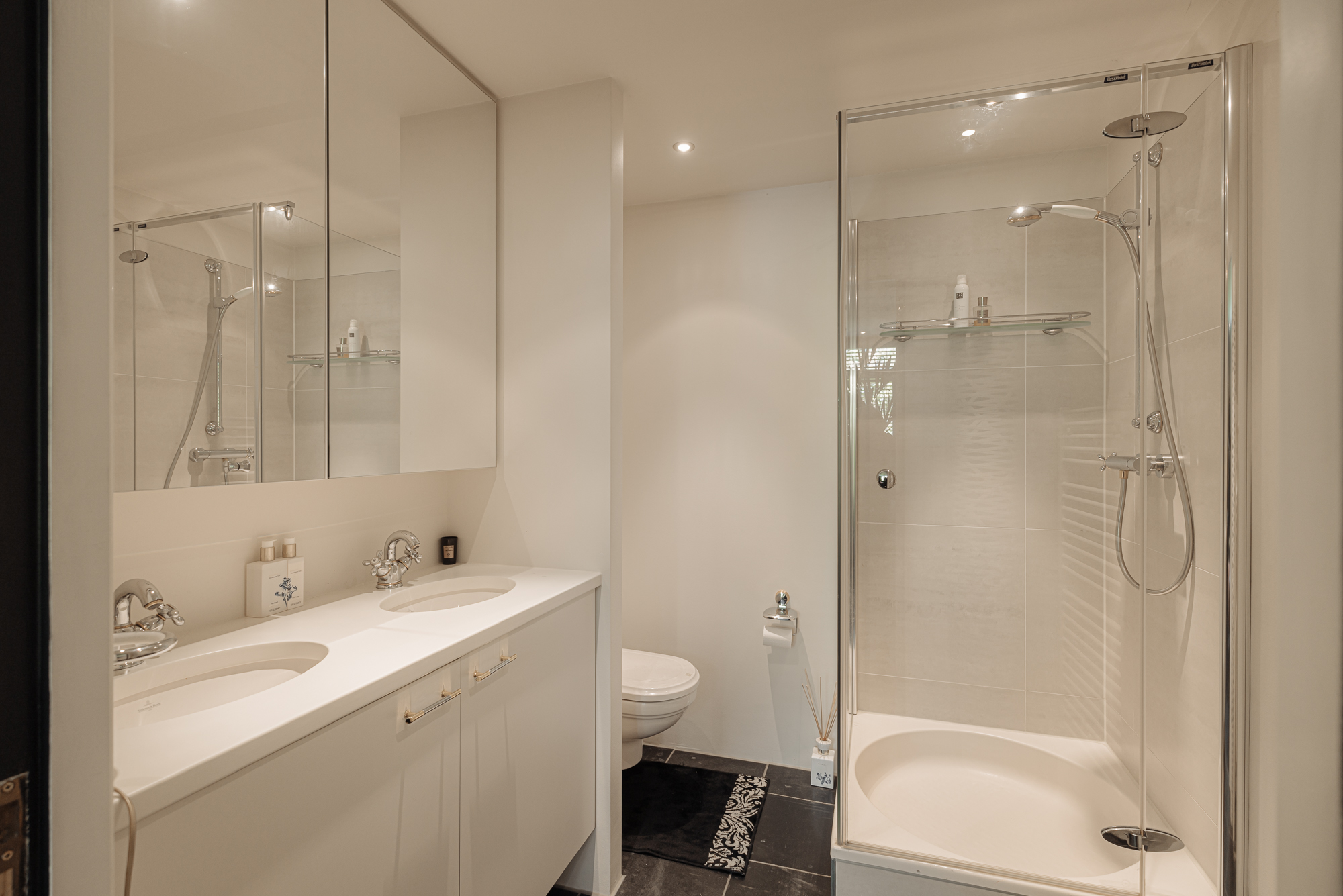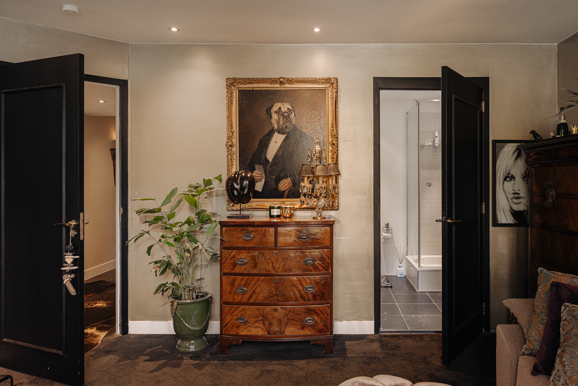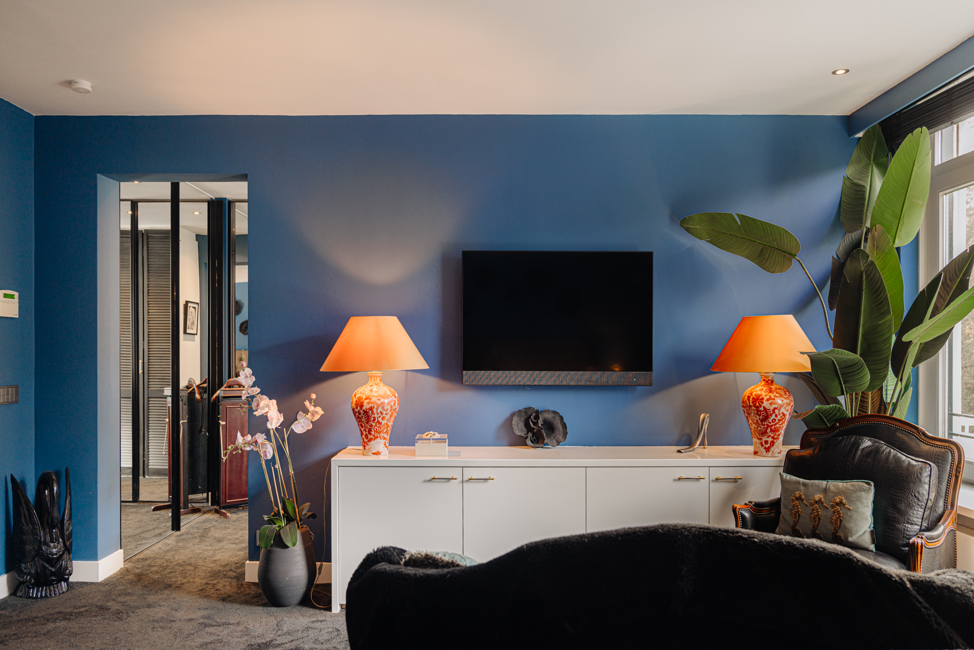 Beautifully situated 4-room penthouse (approx. 265 m² living space) with large balconies on the third floor of a small apartment complex on the Rust en Vreugd Estate. Originally two apartments, it was completely renovated and redesigned in 2009. You will find high-quality materials and luxurious details, including a custom-made interior and air conditioning. There are also two parking spaces and a storage unit in the basement.