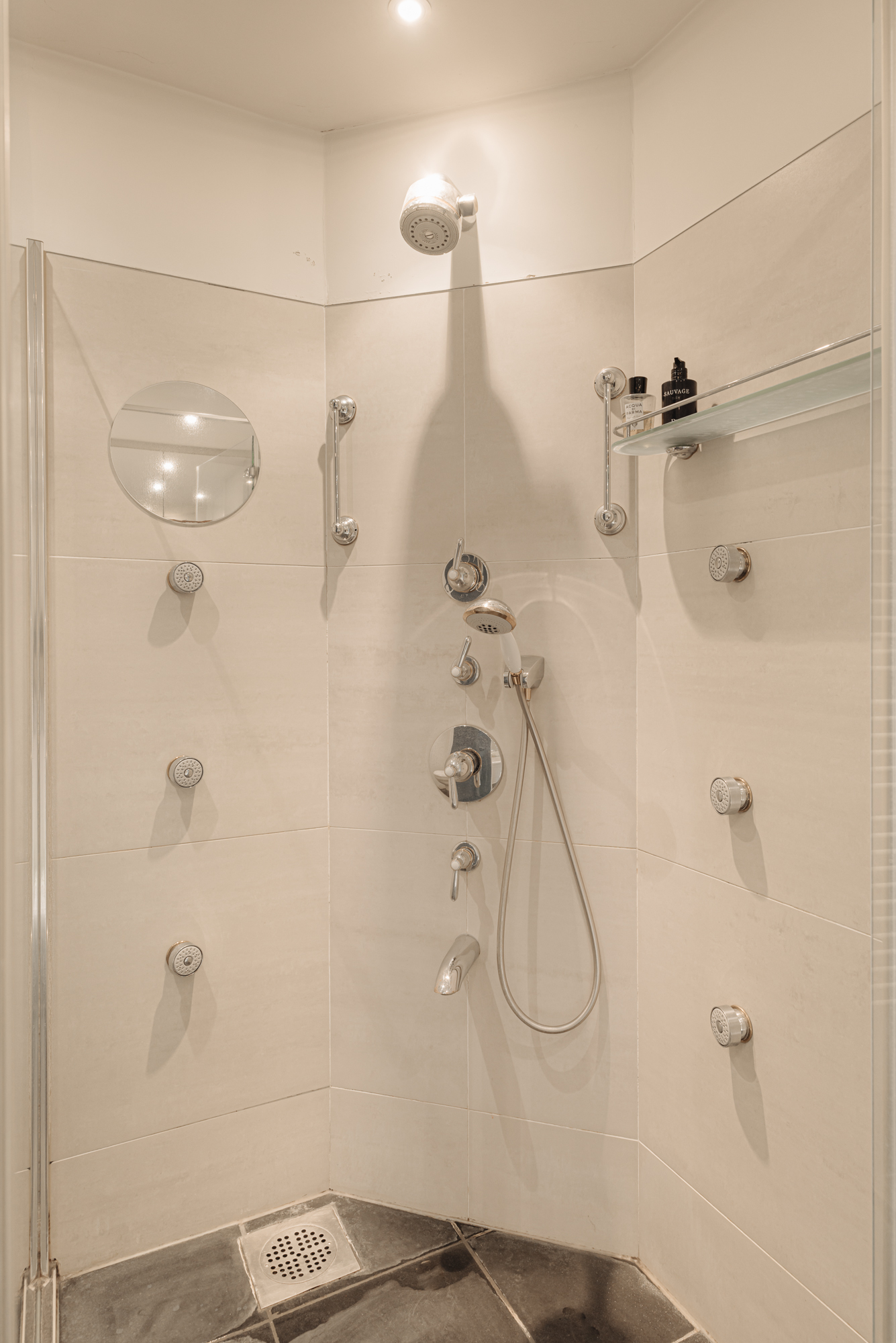 Master bedroom at the rear has an ensuite bathroom with a steam shower, spacious bathtub and double vanity. The second bedroom at the front also has its own bathroom.