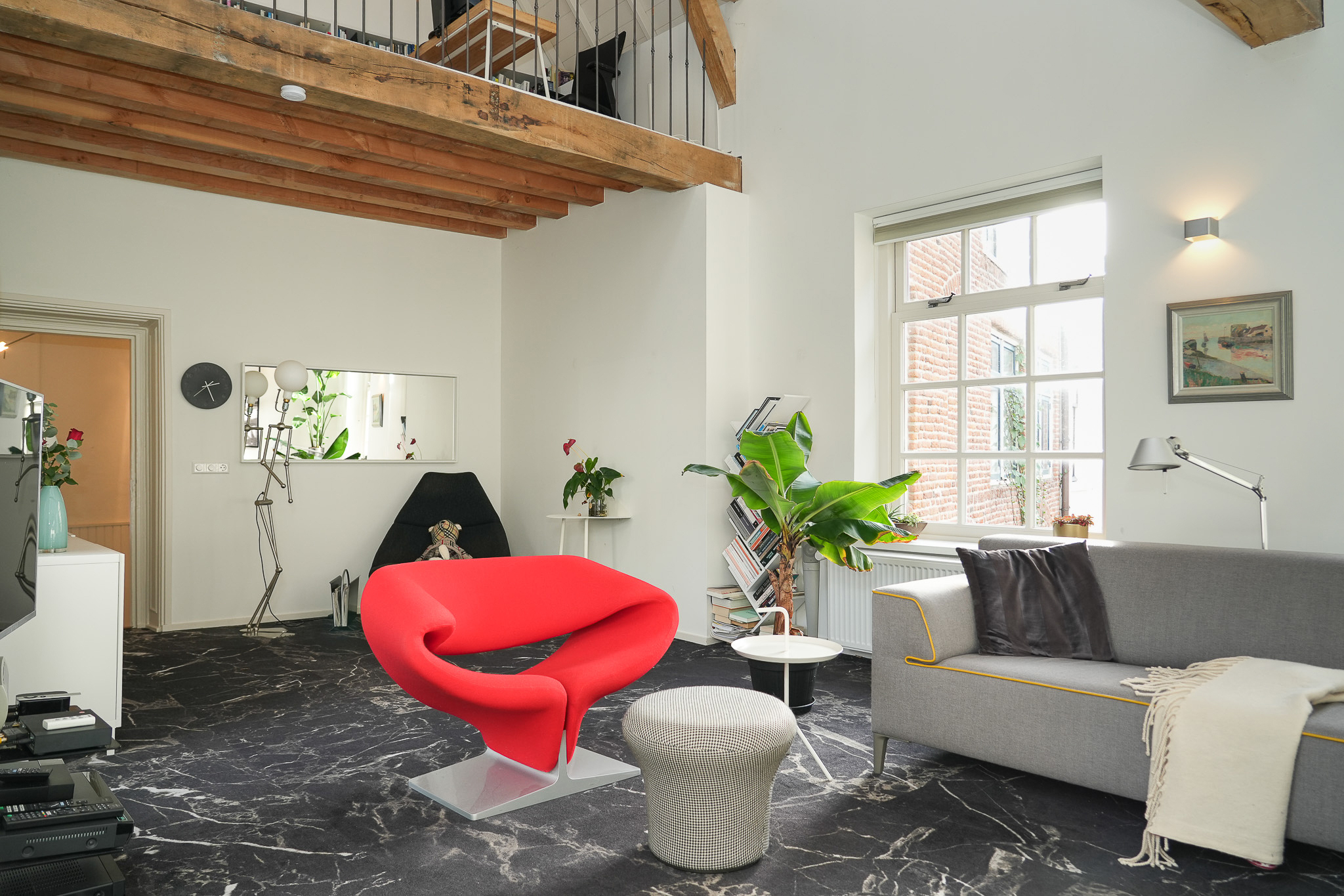 Sunny living room with mezzanine and adjoining roof terrace, bedroom, and a luxury bathroom on the first floor.