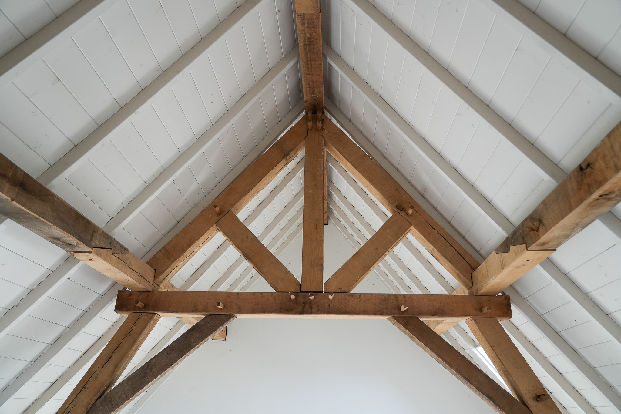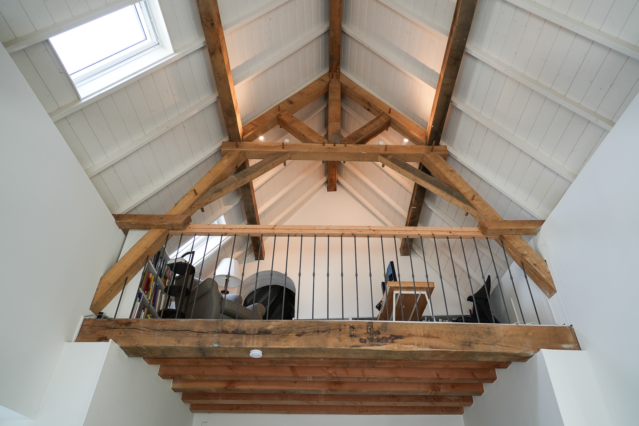 Attic room and study beneath the restored roof structure on the second floor.