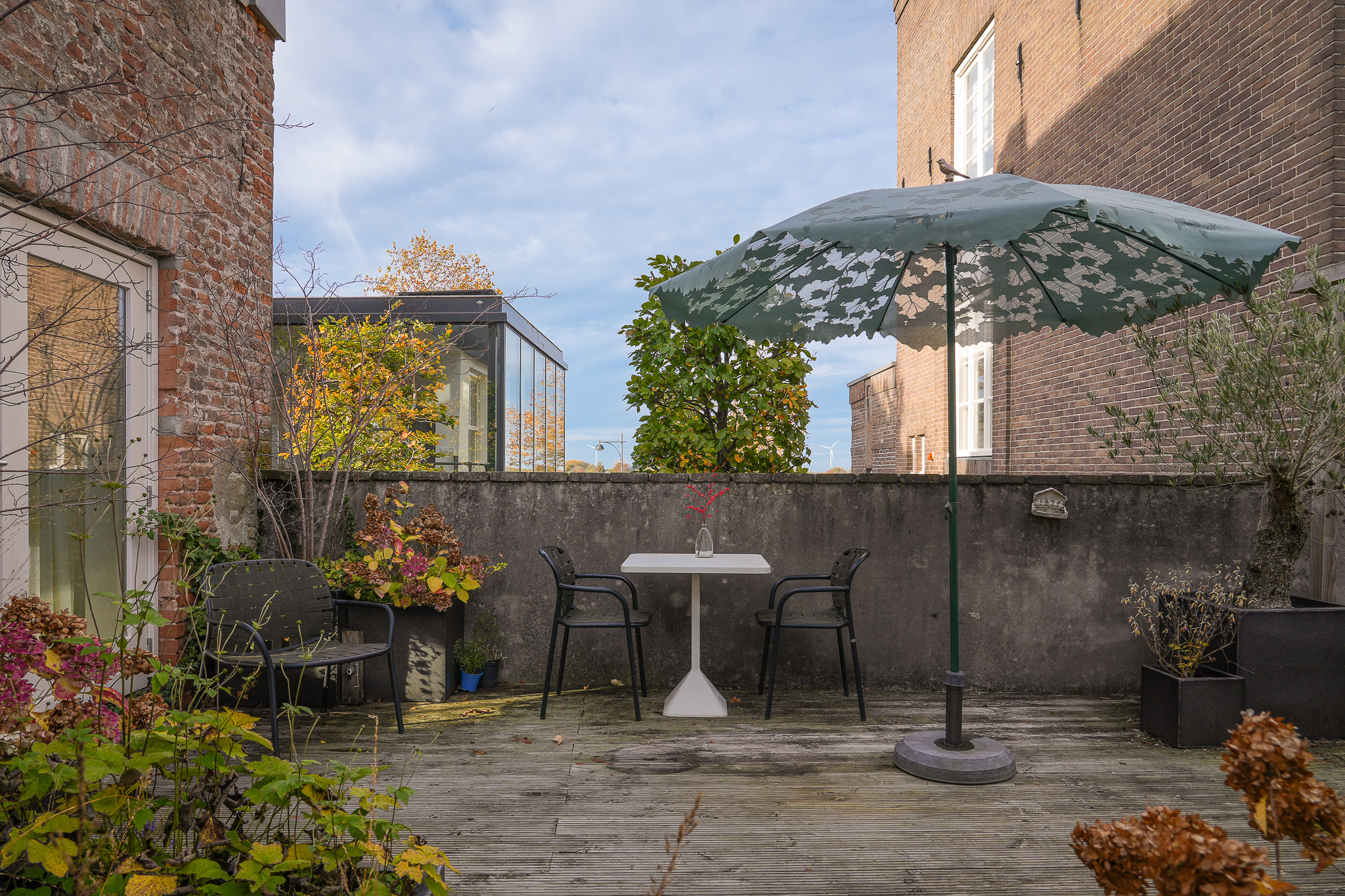 The sunny, private roof terrace (45 m²) was designed under the supervision of a landscape architect. It offers a wonderfully relaxed atmosphere, complete with olive trees, a pergola and carefully chosen planting. Thanks to its sheltered position, there is always a comfortable spot to enjoy the sun or start the day with a cappuccino while gazing towards the river.